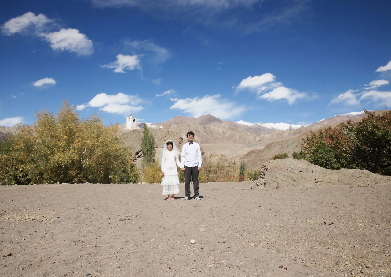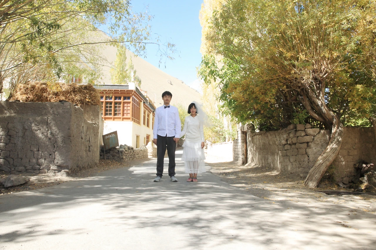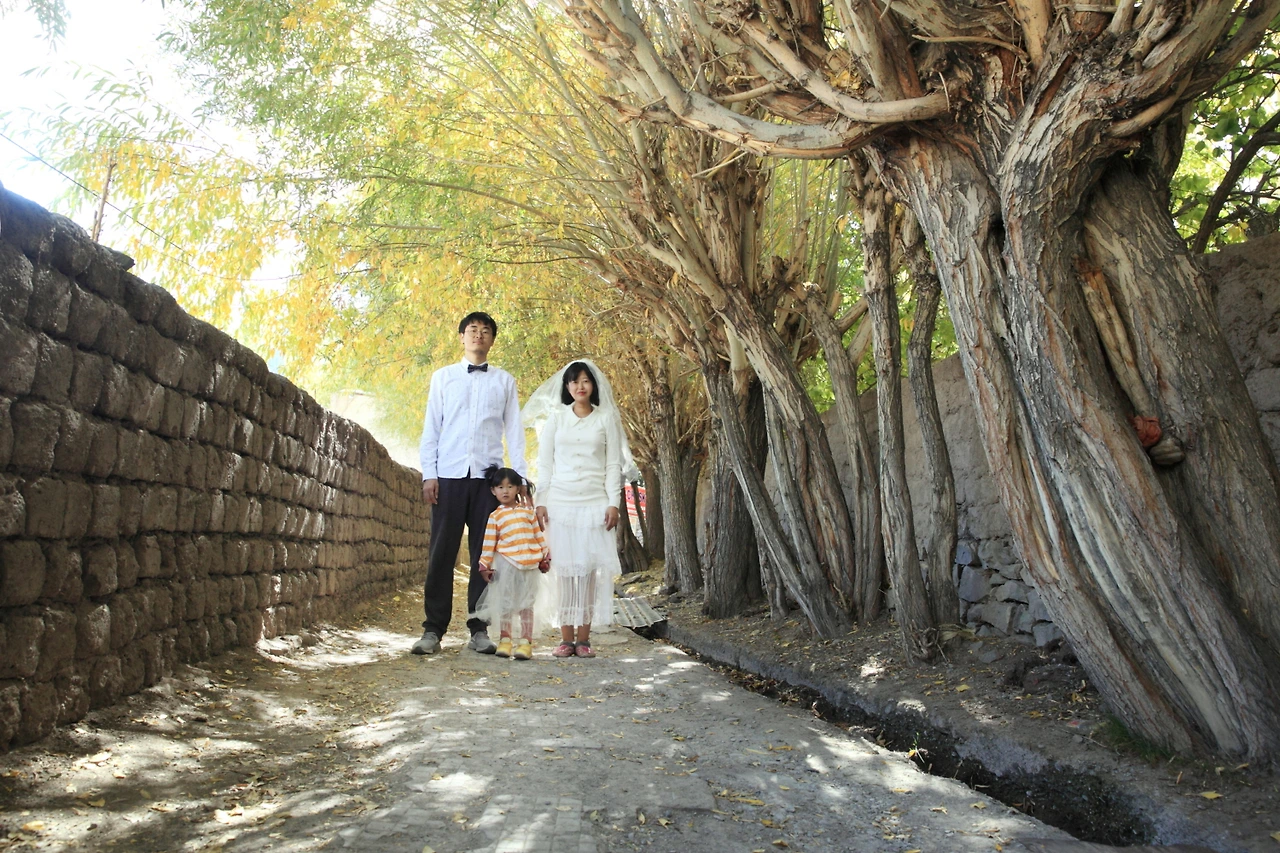 오늘은 웨딩 가족사진을 찍기로 한 날이다 원래는 웨딩사진이지만 달이가 함께여서 웨딩 가족사진이라 부르기로 했다. 여행을 마치고 한국에 돌아가면 곧바로 결혼식이 치러진다. 조금 늦어진 우리의 결혼식을 기념하는 사진을 알치에서 찍어보기로 했다. 사진을 전공했지만 다들 똑같이 찍는 웨딩사진은 찍고 싶지 않아서 우리만의 수더분한 웨딩사진을 위해 한국에서부터 최소한의 옷과 소품을 배낭 한켠에 준비해 왔다. 아침을 먹고 옷을 갈아입고 숙소를 나선다. 딱히 배경을 찾으러 다닐 것도 없이 문밖을 나서자마자 곳곳의 풍경 자체가 그림이다. 숙소 밖으로 이어진 길에서 다이소에서 구입한 경량 삼각대를 놓고 타이머를 맞추고 사진을 찍었다.