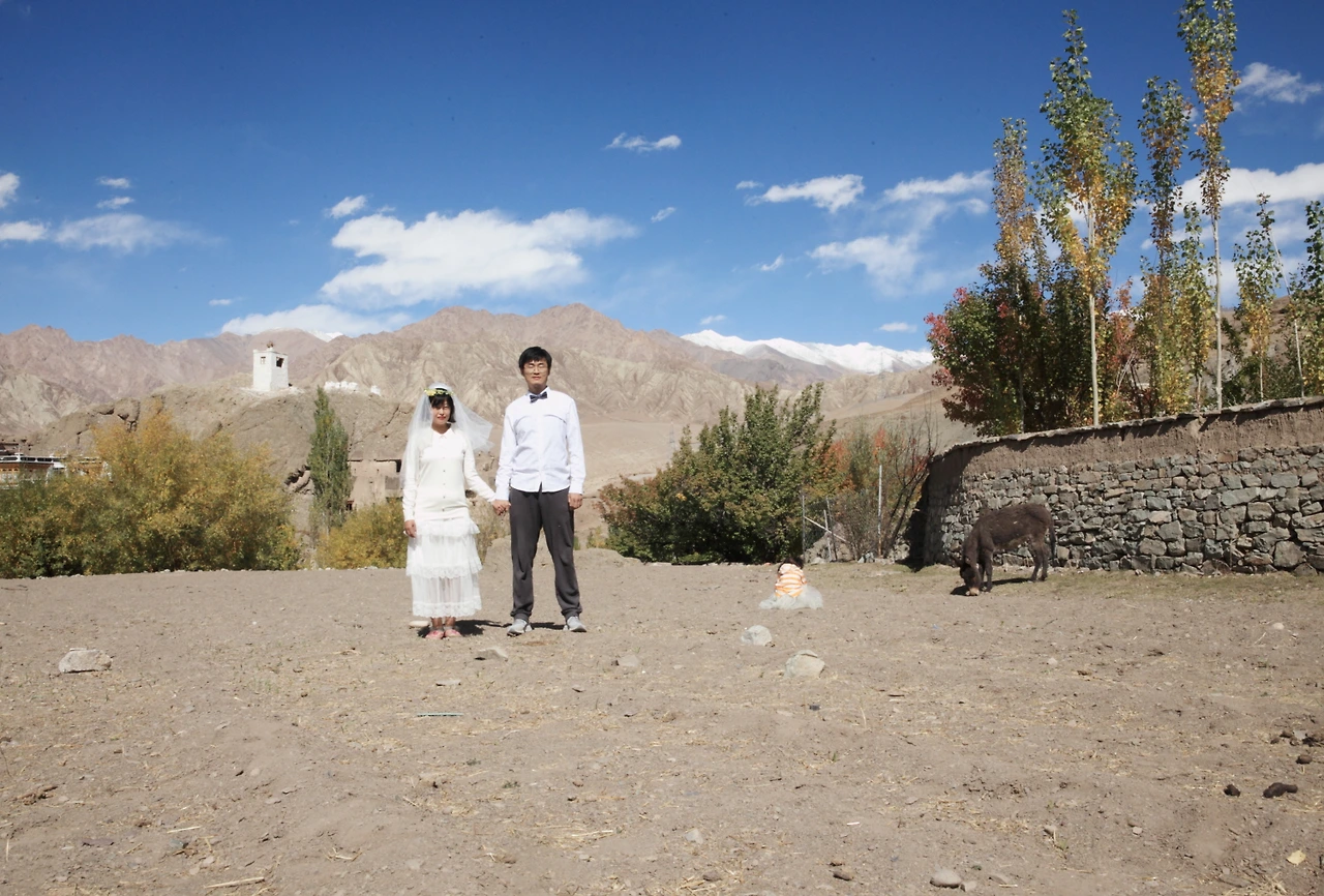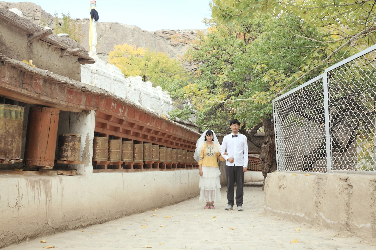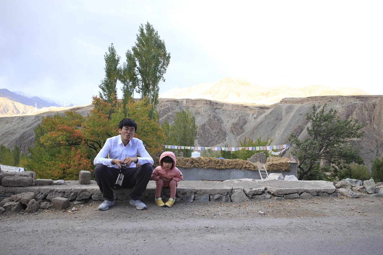 알치를 떠나는 날 마지막으로 식당에서 식사를 하던 중에 달이가 낮잠에 들었다. 버스가 출발 하기까지는 시간이 조금 남아서 식당 의자에 달이를 눕히고 쉬고 있는데 알치곰파 근처 마니차의 풍경이 번쩍 떠오른다. 그곳에서 사진을 찍으면 정말 멋질 것 같았다. 조금의 시간이 있었다. 남편과 마지막으로 사진을 한 장 더 찍어보자고 합의를 봤다. 마음 좋은 식당 아주머니께 잠든 달이를 잠깐만 봐달라고 부탁한 후 소품을 다시 꺼내어 후다닥 사진을 찍고 왔다. 이 사진은 훗날 우리 부부 인생 샷이 되었다.