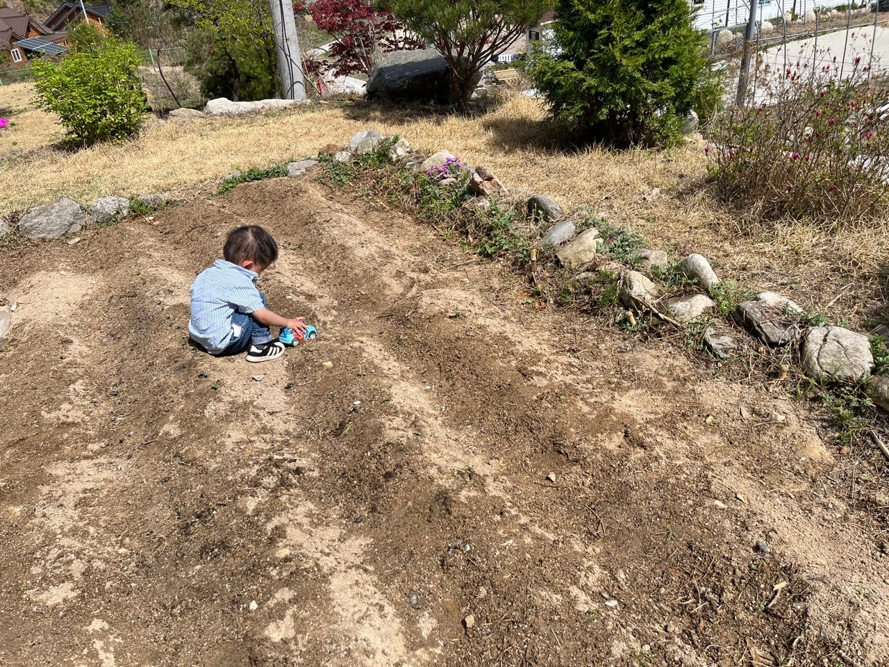 변수가 있다면 아이들의 흙놀이 구역을 따로 마련해뒀는데도 둘째 아이는 구분 없이 텃밭을 다 밟으며 돌아다닌다. 새싹들이 아이를 잘 견뎌주길 바란다.