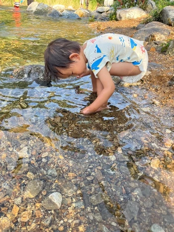 남편이 김밥을 쌌다. 생전 요리를 안 하던 남편이 근래에 요리에 취미를 붙이면서 이것저것 만들기 시작했다. 나로서는 반가운 일이다. 김밥을 잘 못 먹는 아이들을 위해 따로 주먹밥을 만들었다. 이번에는 집 앞에 있는 계곡으로 향했다. 내가 사는 지역은 청정계곡으로 유명한 곳이다. 여름이 되면 사람들이 이 주변으로 모여든다. 덕분에 우리는 차로 2분 거리에 있는 이 계곡을 좀 더 쉽게 즐길 수 있게 되었다. 물에 발을 담가보았다. 정수리까지 차가워지는 느낌이다. 물속에 들어가지 않아도 무더위를 식혀주는 시원한 기운이 계곡에서 뿜어져 나왔다. 차가운 만큼 청명한 느낌 또한 들었다. 첫째는 물론이고 둘째도 발을 담그고 돌과 흙 가지고 몰입하며 논다. 아이들에겐 아주 좋은 청정 자연 놀이터이다. 앞으로 자주 오게 될 것 같다.