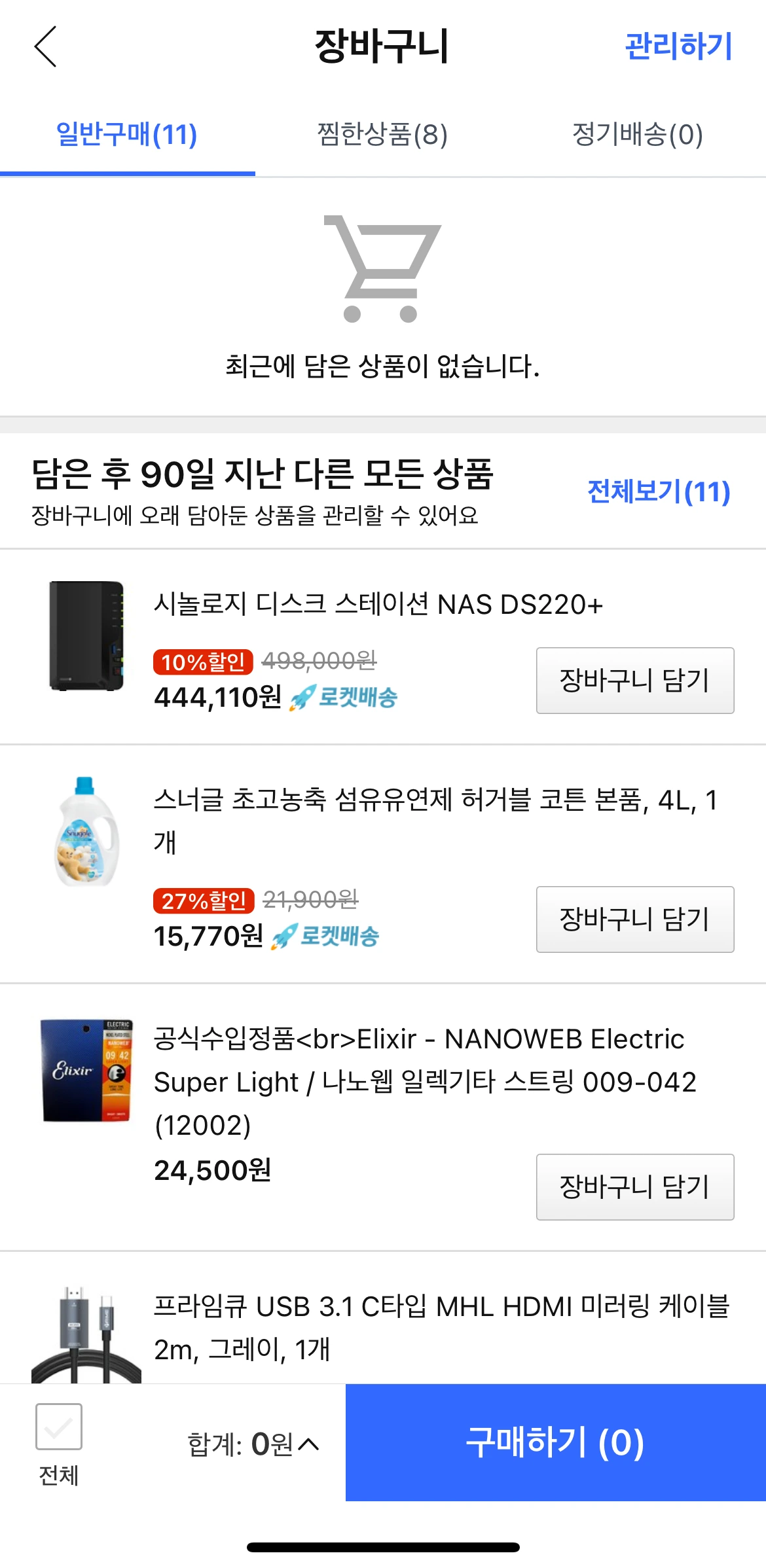 사례 화면은 '찜'화면이 아닌 '장바구니' 화면이지만, 과거에 담아둔 상품에 대한 서비스 흐름이 인사이트를 준다. 바로 '담은 후 90일이 지난 상품'이다. 90일이 지난 상품이면 한 계절이 바뀌고 그 사이에 고객의 상품 관심도는 변했을 것이다. 그 때문인지 쿠팡은 장바구니에 최근 담은 상품을 바로 구매할 수 있도록 90일이 지난 상품은 장바구니에서 제거되며 90일 지난 상품 영역을 구분해 다시 장바구니에 담을 수 있도록 서비스를 제공하고 있다.