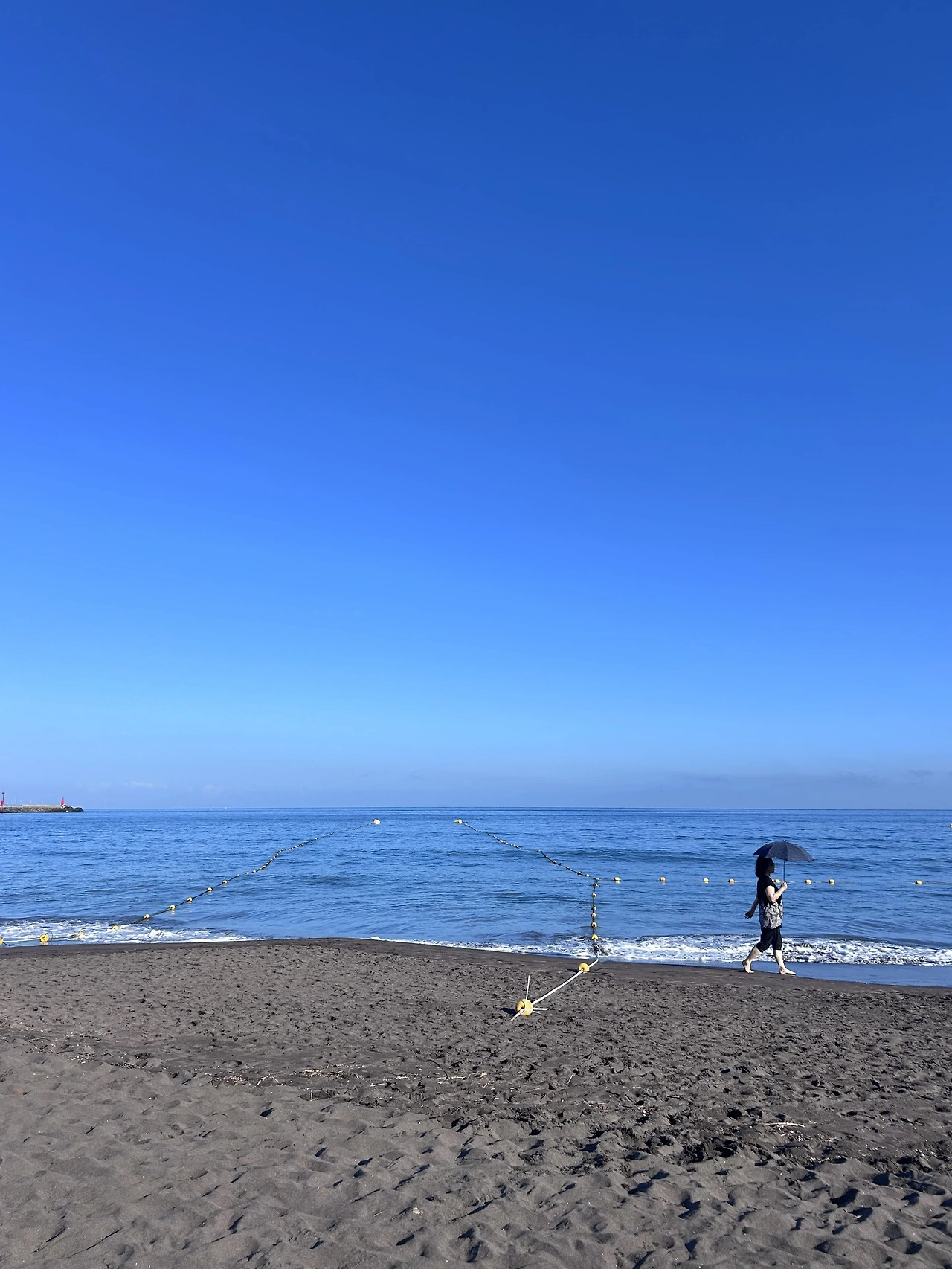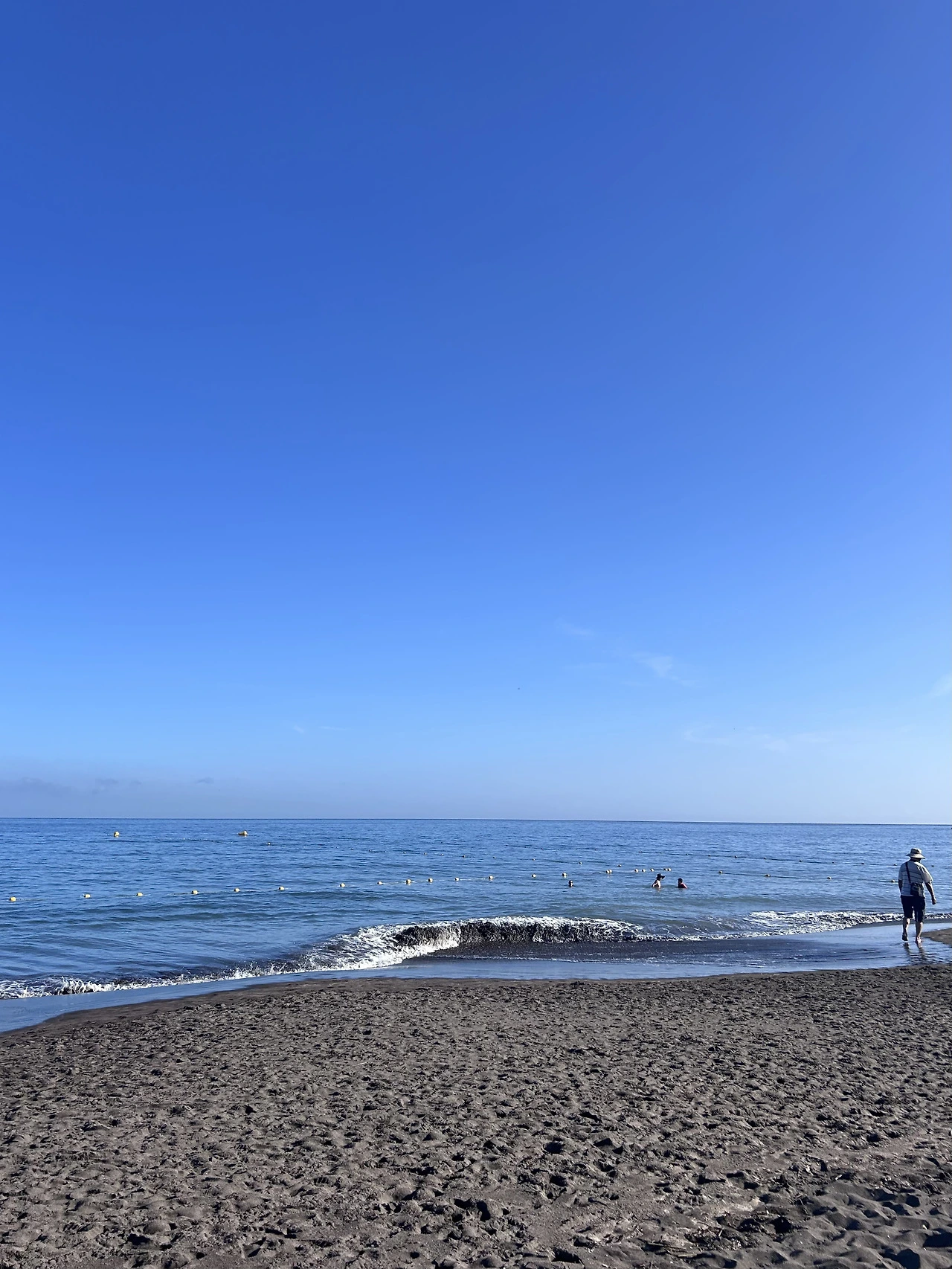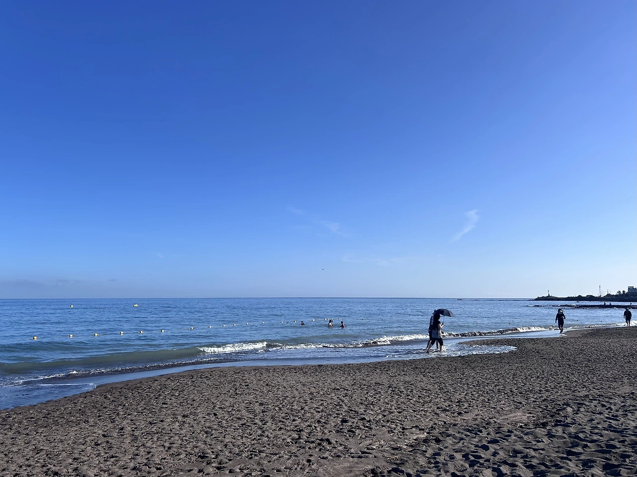 이 밝은 쪽빛, 탁 트인 하늘색이 너무 좋아요. 특히 해가 세지 않은 아침의 바다는 조금 더 옅은 하늘색으로, 미묘하고 독특한 분홍과 보라색이 은은히 섞인 하늘색을 도도하게 펼쳐 놓는답니다! 마주하기만 해도 설레는 풍경이지요. 이 색도 그대로, 바다를 따라 맨발로 걷는 사람들의 모습도 그대로라 무척 반가웠어요.