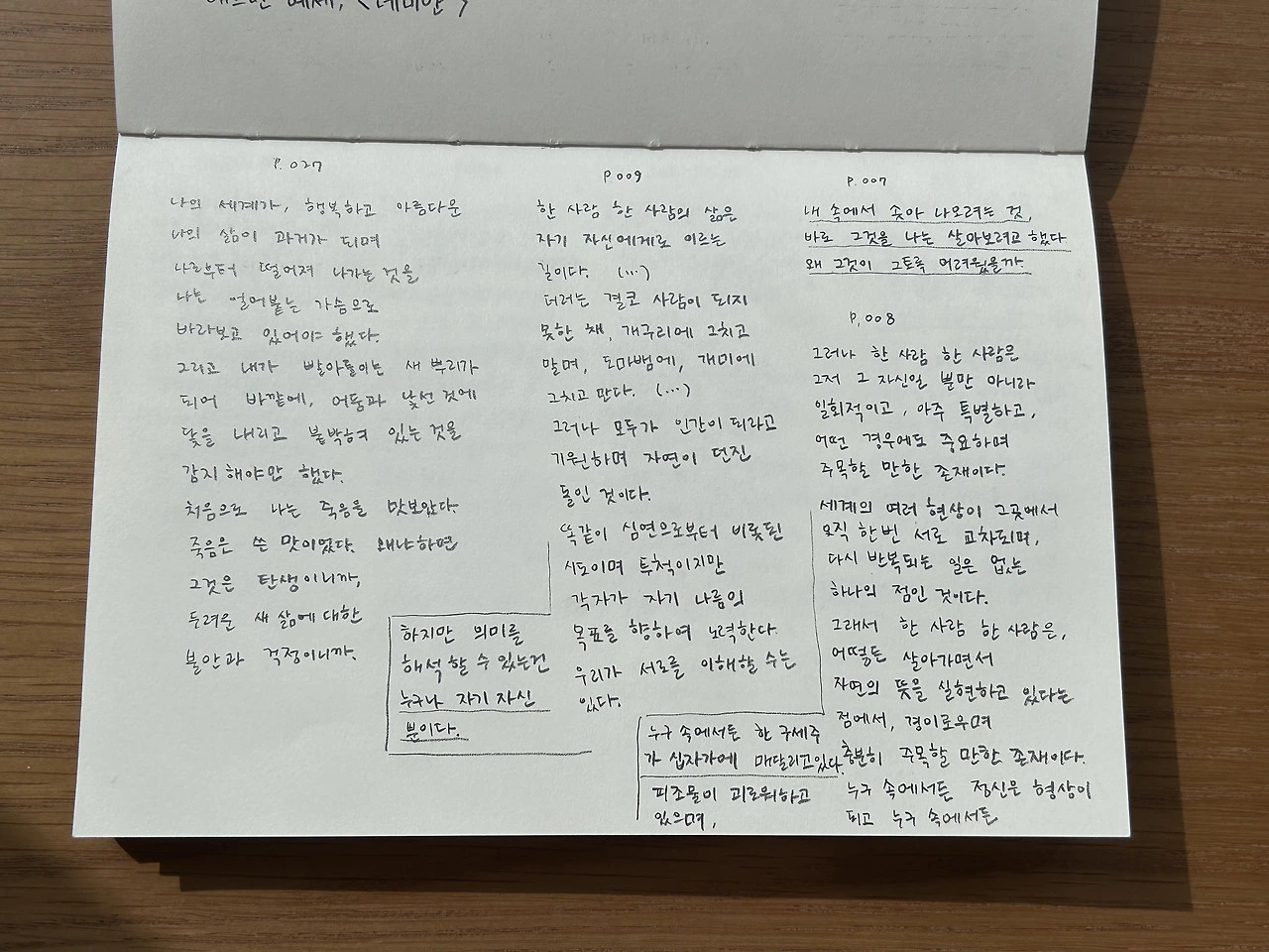 아 참, 책을 좋아하고 꾸준히 읽을 수 있었던 또 다른 비결은 '필사에 재미를 들인 것'입니다. 스마트폰이 없을 때 독서를 많이 하다 보니 좋은 부분을 사진 찍기보다 손으로 공책에 받아 적는 습관이 생겼습니다. 그래서 스마트폰이 다시 생긴 지금도 좋아하는 책은 꼭 필사를 해야 직성이 풀리는데, 책을 아날로그적으로 대하면 대할수록 더 깊은 애정이 생기는 것 같다는 개인적인 의견입니다.
