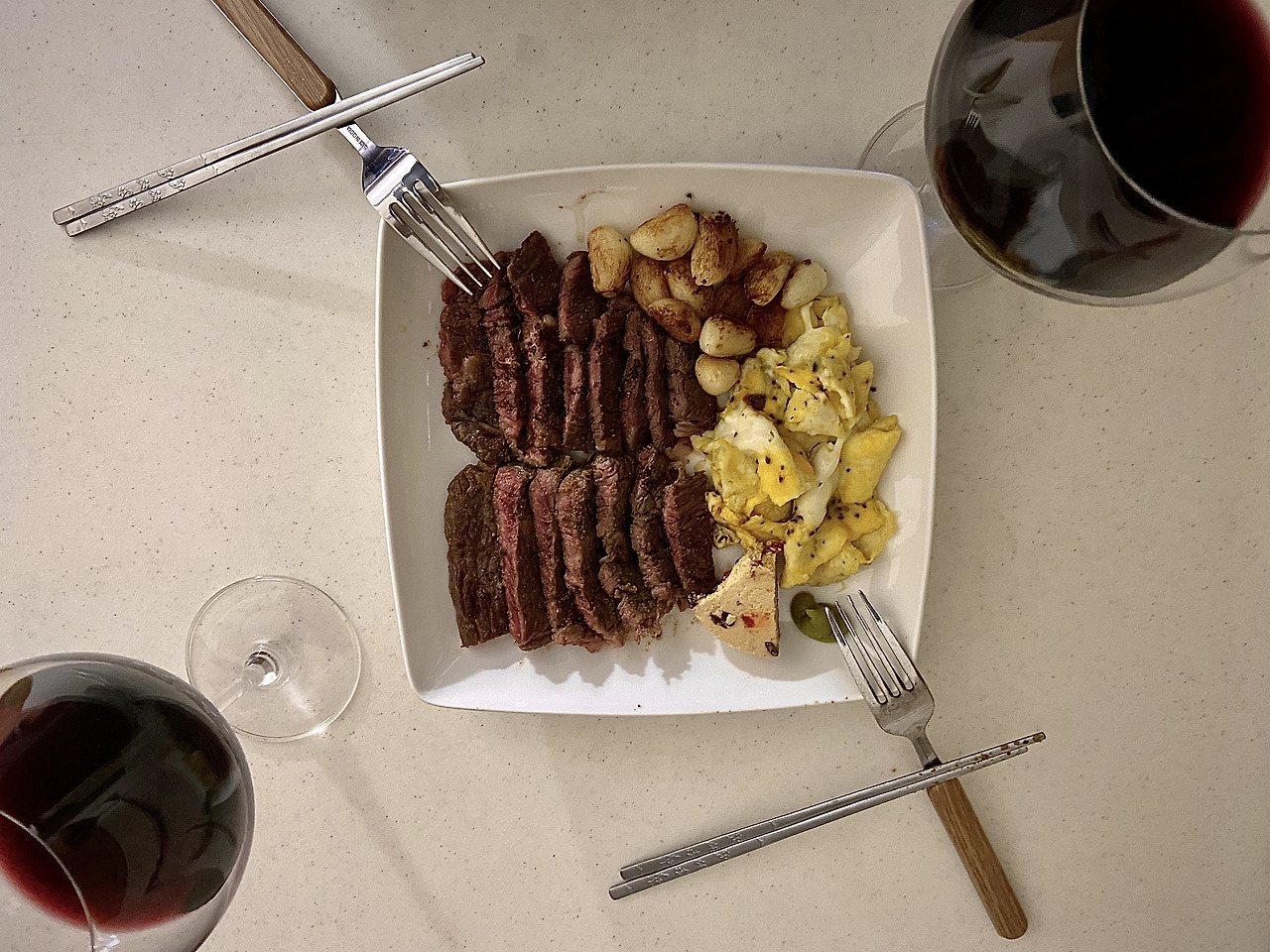 기쁜 일을 축하해주기 위해 그가 또 정성스레 소고기를 손질했다. 거듭할수록 완벽해지는 Medium Rare의 적당함으로 이제 그의 주요리가 된듯하다. 입에 감도는 부드러운 고기의 식감과 함께 마늘과 프라이가 곁들여지면 잔치의 향연이다.
