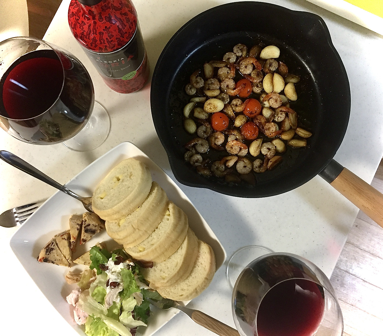 두 번째 밥상은 감바스와 치즈 플레이트. 2019년의 마지막 날을 기념하는 밥상이기도 하다. 칵테일 새우와 내가 좋아하는 구운 마늘이 듬뿍. 고소한 아보카도 오일로 새우가 자작해질 때까지 익힌다. 자작해질 때 즈음에 빨간색의 방울토마토로 보기 좋게 채도를 더해준다. 치즈와 빵이 있는 플레이트는 정말 취향저격이다.