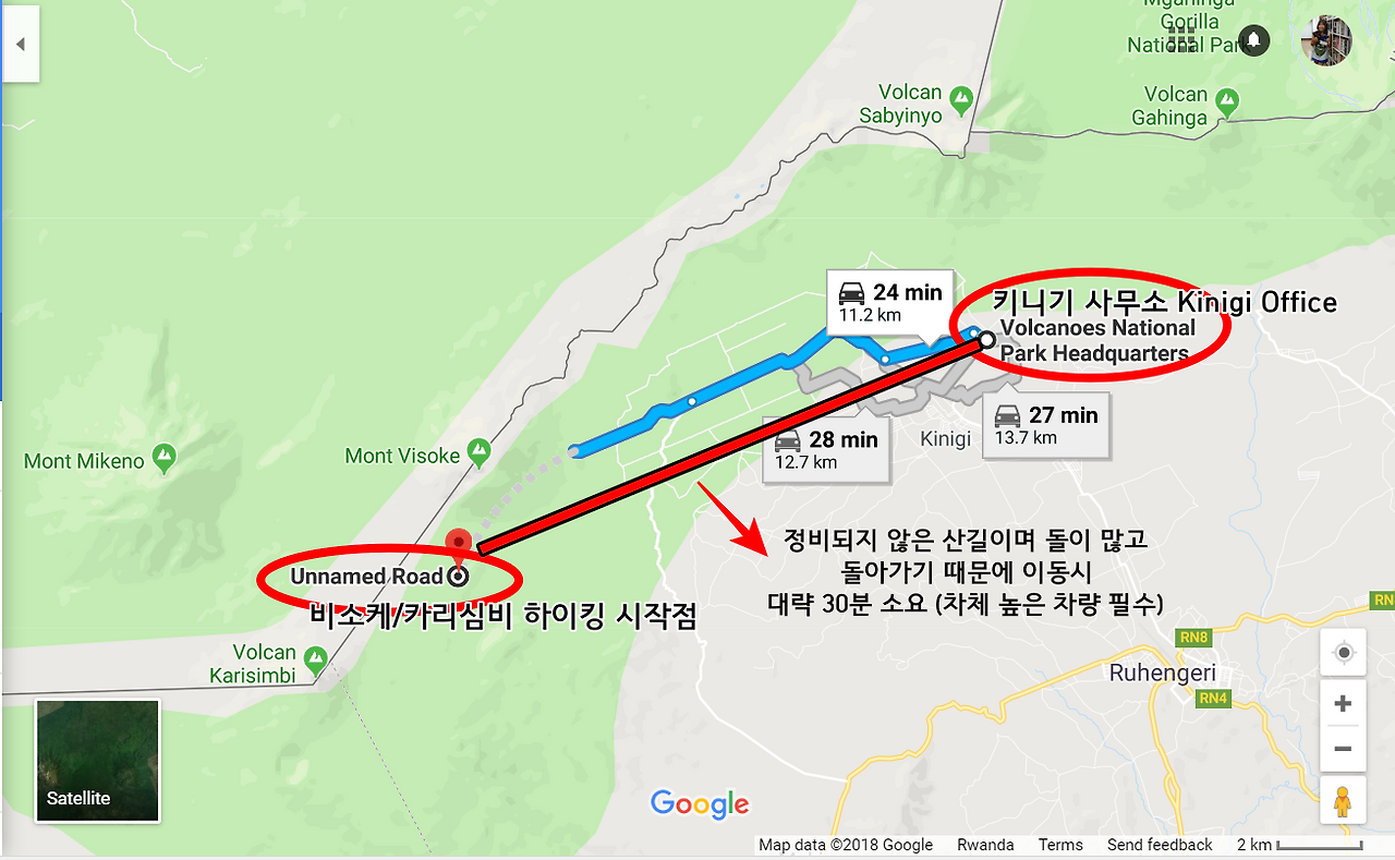 - Kinigi 안내소에서 산 입구까지는 대략 20~30분 소요. 가는 길이 정비되지 않은 산 돌길로 되어 있으므로 가능하다면 차체가 높은 차량을 빌려야 함