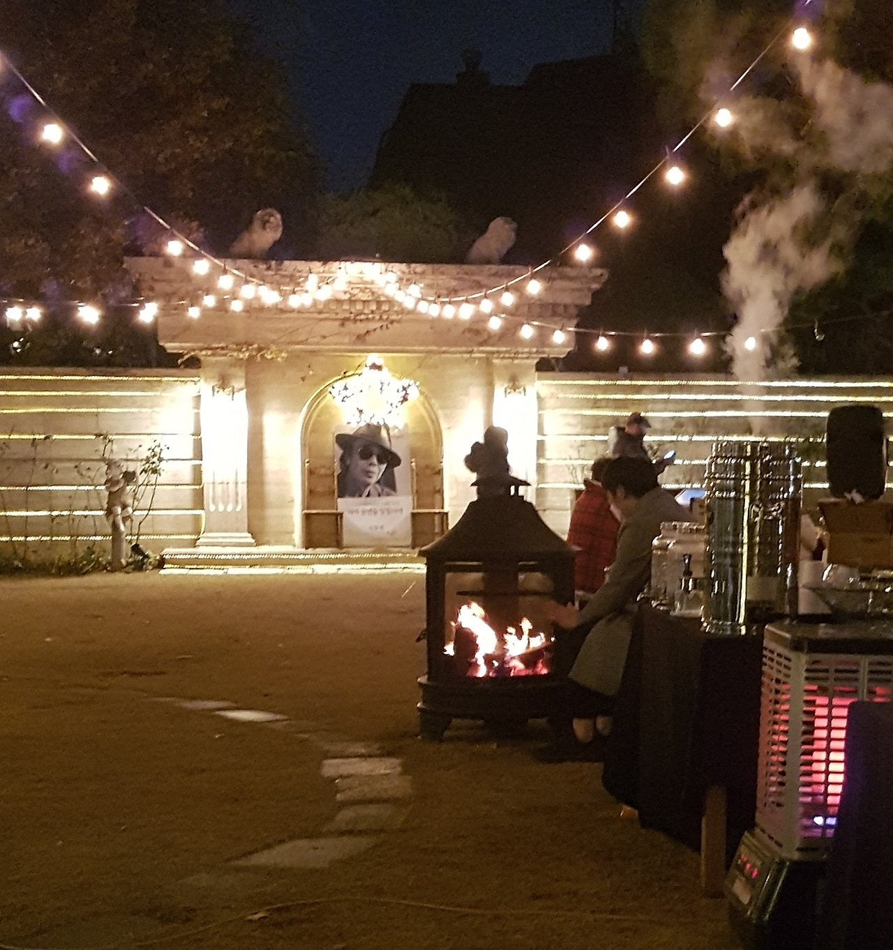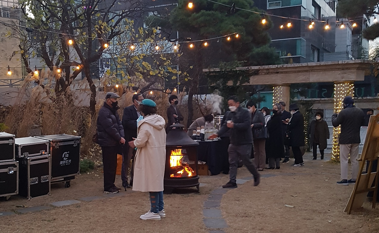떨어진 기온 탓에 마당엔 난로불들이 지펴지고 머리가 하얗게 센 출연진이나 빠른 소문 접한 관객들이