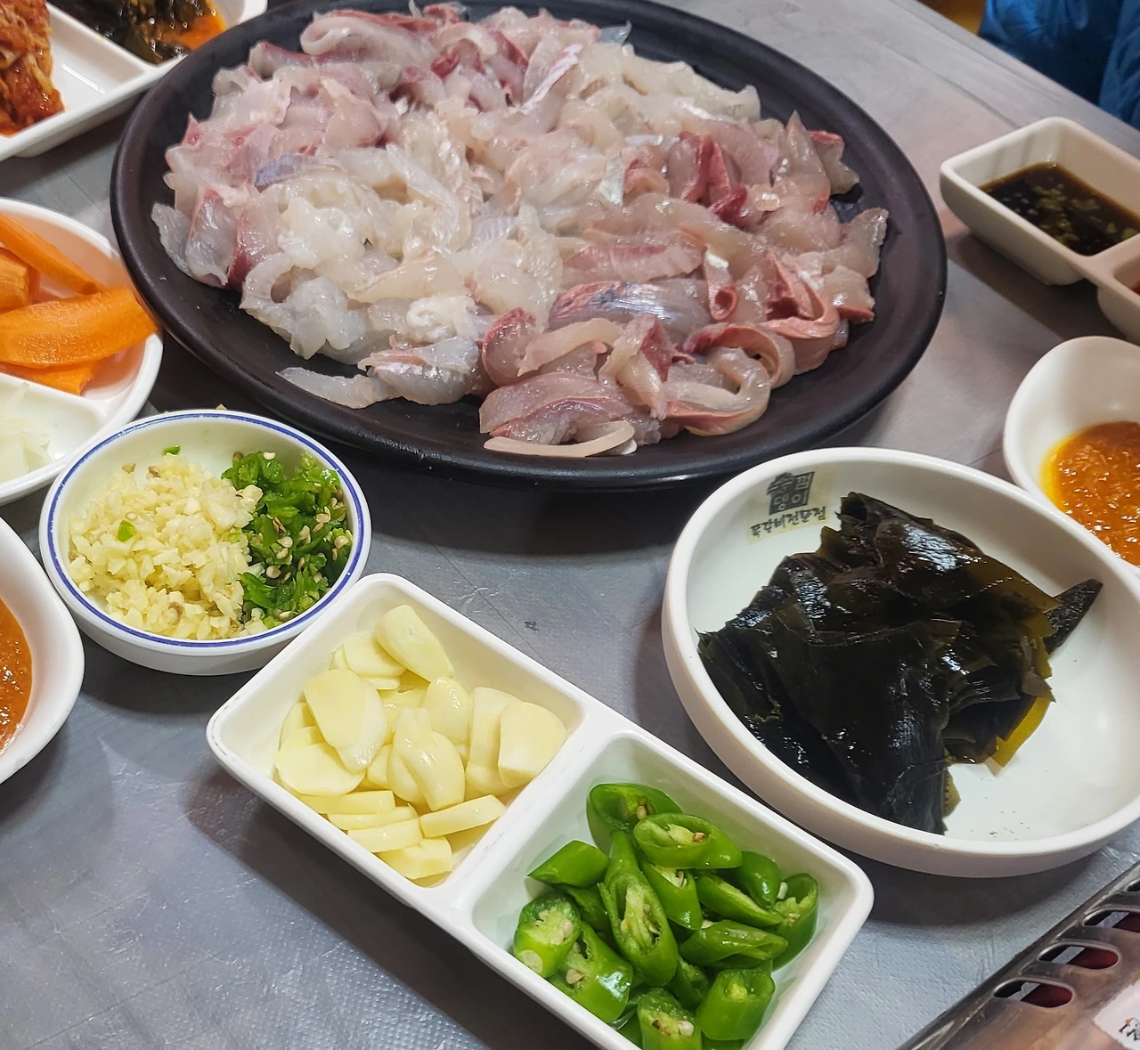 어시장에서 갓 잡은 싱싱하고 찰진 회를
