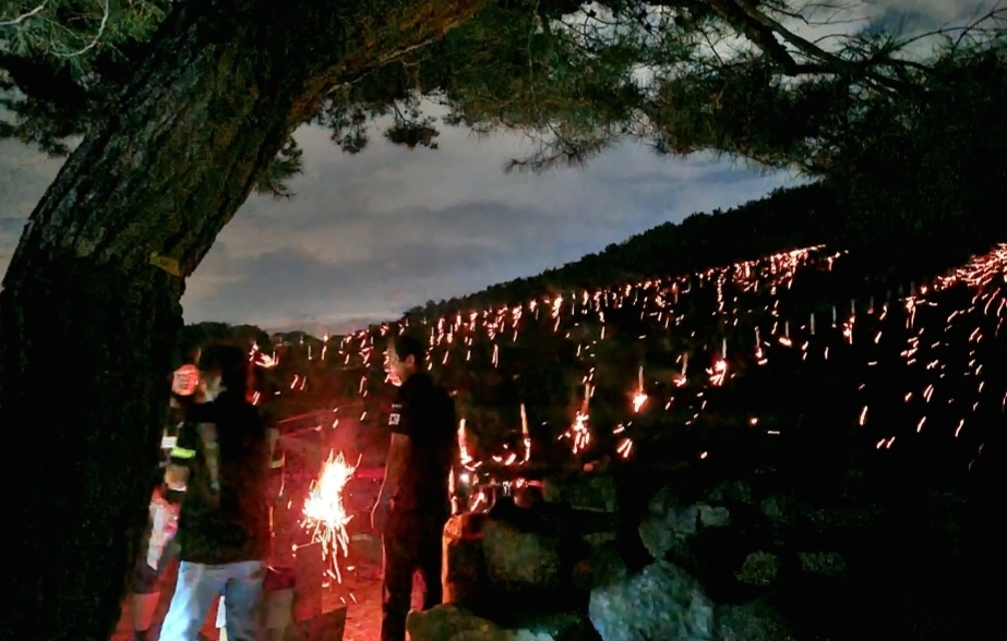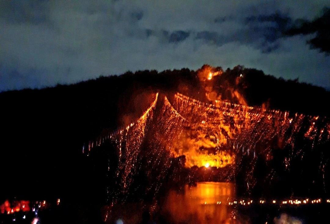 칠흑 같은 밤 얼마나 아름답고 우아하게 강물 위로 떨어지는지 시끄러운 서구식 폭죽놀이와는 분위기가 완전 달랐다. 숯과 마른 쑥을 담은 수많은 봉지를 엮은 줄에 불을 당긴다.