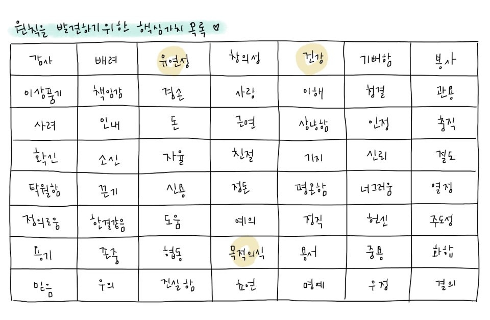 아래의 가치 단어 목록에서 이 여행의 목적을 달성하기 위해 추구해야 할 가치를 몇 가지 정했다.