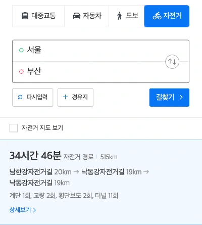 서울에서 부산까지 도보(자전거길)로 515km, 산티아고 순례길은 800km이다.