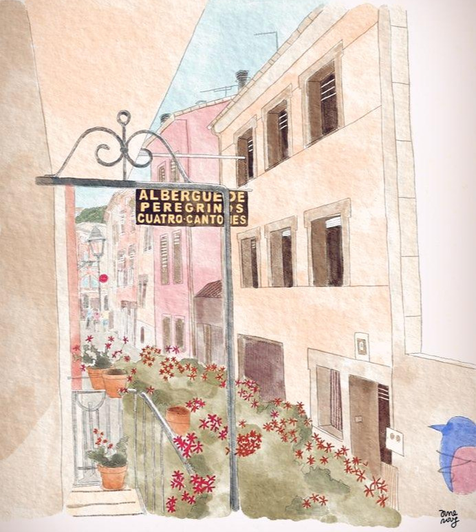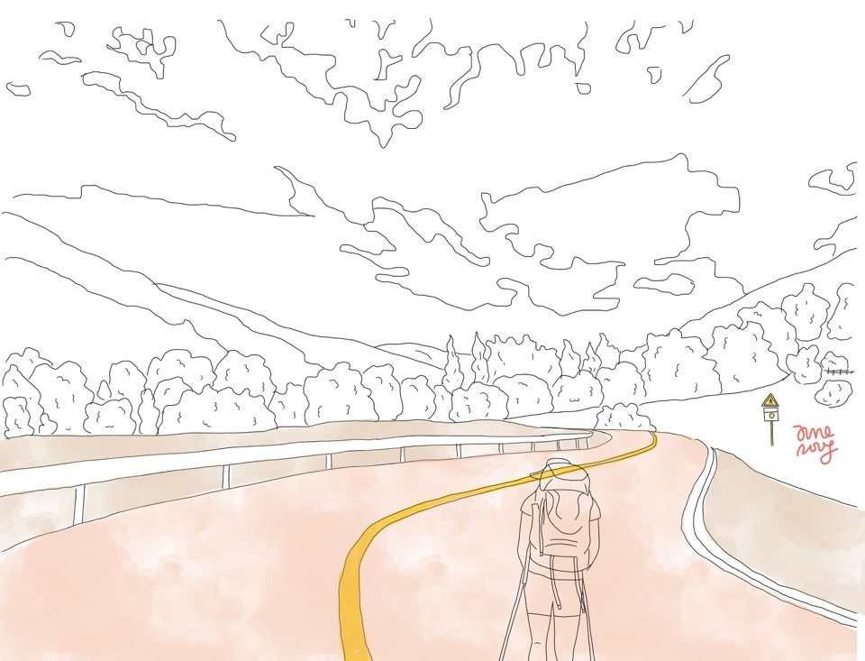 창 밖으로 재잘재잘 떠들며 목적지를 향해 걷고 있는 순례자들이 보였다. 다양한 국적의 사람들 속에 있다는 사실이 떠오르며 감격하려는 찰나, 저 멀리 스페인의 파랗고 넓은 하늘이 눈에 들어왔다.