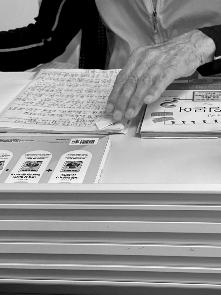 구순은 되어 보이는 백발의 노인이 지팡이와 함께 도서관에 들어온다. 햇빛을 가리기 위해 썼을 흰 모자를 벗고 가방에서 책과 노트, 볼펜 몇 자루를 조심스레 꺼내기 시작한다.