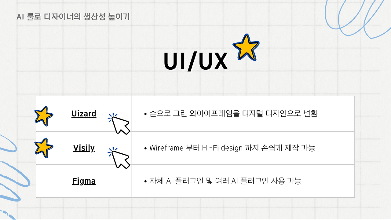 프로덕트 디자인의 여러 업무 스코프에 맞춰 사용하기 좋은 AI 툴도 추천해 주고, 제가 실제로 진행한 프로젝트 케이스 스터디도 했고요, 1시간 가량의 AI 툴 사용 실습까지 알차게 넣었습니다.