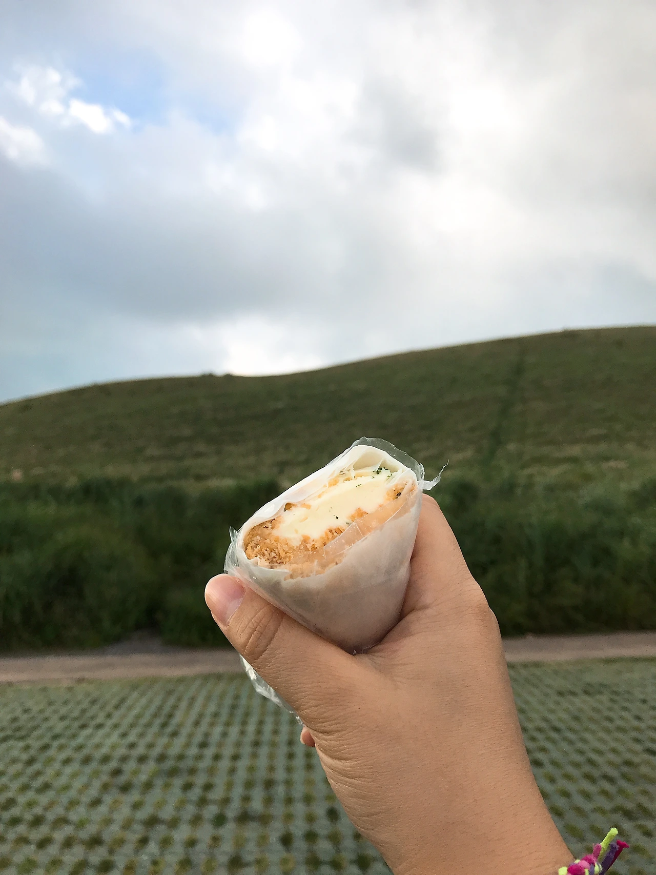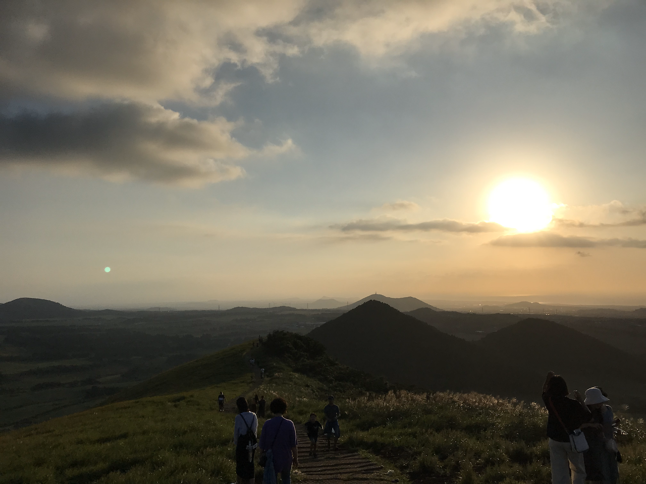 천천히, 그리고 나란히 아내와 새별오름을 오르기 시작했다. 푸른 들판은 조금씩 가팔라지기 시작했고 풀린 신발끈을 질끈 다시 묶었다. 조금씩 높이 올라가며 펼쳐지는 풍경은 예술이었다. 초록빛으로 가득한 들판은 평화롭고 아늑해 보였으며, 중간중간 눈으로만 담기 아쉬운 순간은 카메라 렌즈로 담았다. 굳이 힘이 달리진 않았지만, 끌어주고 밀어주며 오르다 보니 어느덧 정상에 다다랐다. 해발 519.3m의 꼭대기는 아담했지만, 아름다웠다. 달콤한 땅콩 아이스크림을 팔던 푸드트럭은 콩알만 하게 보이고, 어느덧 눈 앞에는 자연만이 펼쳐졌다. 우거진 수풀, 반대편에는 아름다운 능선의 오름들이 가득했고, 6시가 넘어 일몰시간이 다가왔다. 물을 한 모금 마시고, 자리를 잡고 아름답게 퍼지는 황금빛 색깔을 바라보는 시간은 꽤나 낭만적이었다.