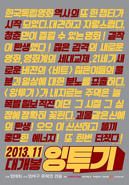 엄태화 감독은 2013년 온라인에서 번져있는 문화를 스크린으로 옮겼다. 다 쓰고 남았다는 의미의 단어 '잉여'로 대표되는 청춘의 세태를 현실적으로 그려냈다. 아무 의미 없는 악플을 달고 낄낄거리는 키보드 워리어. BJ가 욱여넣는 음식을 보며 별풍선을 날리고 즐거워하는 유저, 인신공격의 분노를 참지 못하고 결국 실제 주먹다짐, 심한 경우 살인으로까지 이어지는 현피. 치열한 스펙 경쟁의 이면에는 매우 평범하고 보통의 청춘들이 숨 쉬고 있다. 물론 낙인이 찍힌 채 오프라인에서는 조용히 지낼 뿐이다. 이들의 공통점은 익명성의 공간에서 자신의 존재 이유를 나름대로 찾는다는 점이다. 20, 30대 청춘은 누구보다 사랑받고 싶고, 인정받고 싶어 하는 존재다. 하지만 냉혹한 현실은 그렇지 않다. 줄을 세우고, 남들과 항상 비교하며 깎아내리기 급급하기 때문이다.