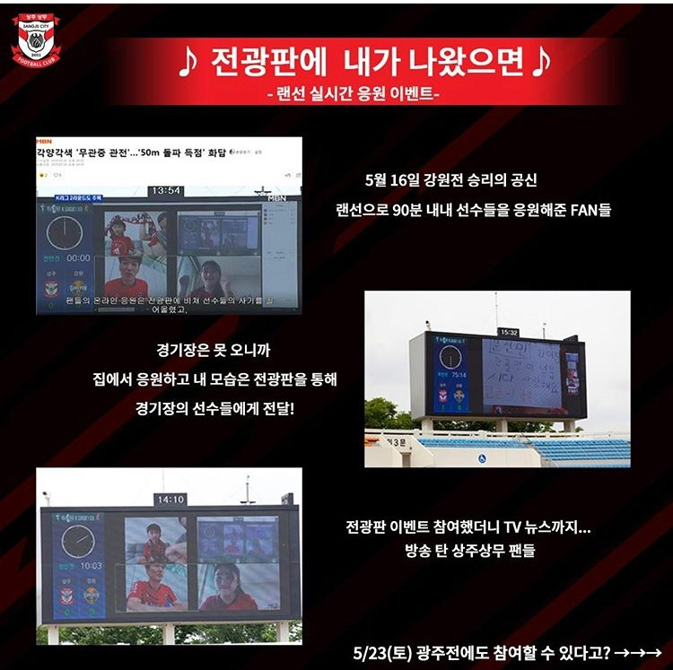 코로나 19를 정면 돌파한 K리그1 개막전은 전 세계 1,900만 명이 지켜봤다. 선수단, 관계자 예방 수칙, 홈경기 운영, 유소년팀 대응 방안 등을 담은 'K리그 코로나 19 통합 매뉴얼'은 영문 번역해 AFC 소속 46개 회원국과 공유했다. 무관중 경기로 진행되어 텅 빈 관객석을 메우는 아이디어도 빛났다. 응원곡, 함성, 야유 등을 단계 별로 나누어 적재적소에 틀어 허전함을 달랬다. 대구FC는 '인형이 기부되는 착한 S석 응원'을 준비했다. 빅토, 리카 인형을 구매하고 원하는 선수의 이름과 함께 관람석을 채웠고, 이후 지역 아동에게 기부됐다. 안산 그리너스 역시 시립어린이집 관원 1,500여 명이 그린 예쁜 그림으로 응원의 메시지를 전했다. 코로나 19가 만든 색다른 사회공헌 활동, 이벤트는 뜻깊은 2020 K리그의 문화를 만들었다.