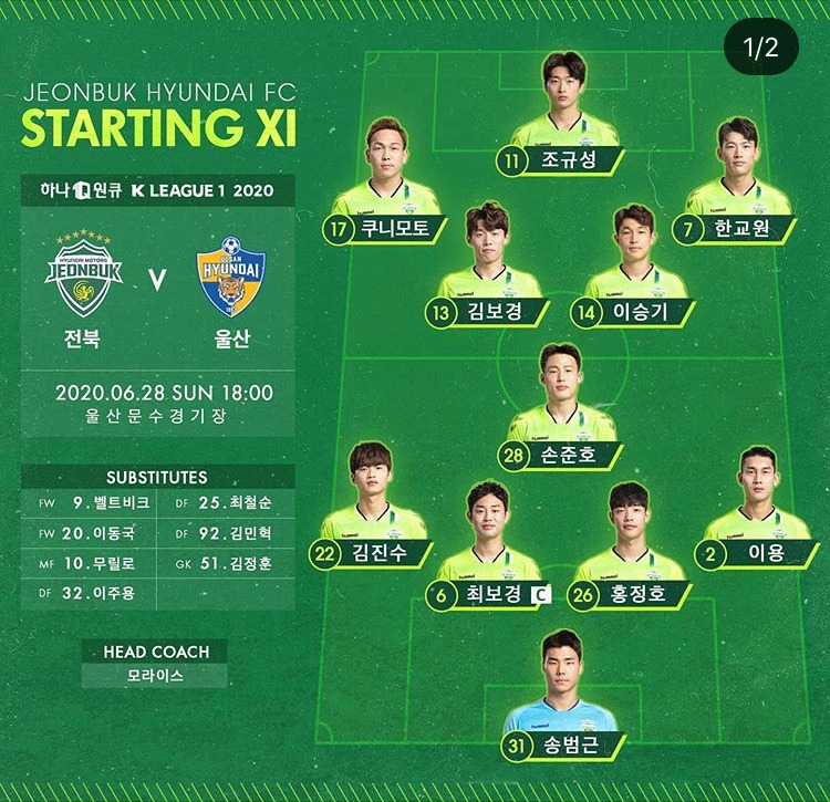 후반전 비욘존슨을 투입해 높이를 공략해보려 했지만, 이미 승부의 추는 전북에게 기울었다. 전북은 지도자 교육에서 복귀한 이동국을 투입해 추가골을 노렸고, 무릴로, 김진수의 슈팅을 아슬아슬하게 조현우가 막아내는 양상이 이어졌다. 울산은 후반 25분 이청용까지 투입하며 총력전을 펼쳤지만, 추가시간 페널티 지역에서 김인성의 슈팅마저 송범근의 슈퍼세이브에 막히며 무릎을 꿇었다. 게다가 경기 종료 직전 쿠니모토가 완벽한 개인기로 측면을 허물고 골망을 흔들며 미리 보는 결승전을 기분 좋게 마무리했다. 설영우, 윤빛가람의 수비를 가벼운 몸놀림으로 벗겨내고, 조현우가 꼼짝 못 할 코스로 날린 슈팅이 일품이었다. "이제 리그에서 한 번 졌다. 다음 경기 준비 잘하겠다" 김도훈 감독의 말은 무척 담담하지만, 중요한 순간마다 미끄러져 우승을 놓친 작년의 악몽이 되살아나는 듯하다. 변수인 퇴장이 발생하긴 했지만, 슈팅수(21대 4)만 보더라도 완벽하게 패한 경기였다.