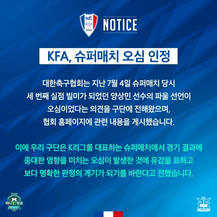 대한축구협회 심판위원회는 13일 공개적인 심판 언론 브리핑을 개최했다. 지난 포항 스틸러스와 수원 삼성의 후반 39분 김민우의 득점 취소에 관련된 논란이 뜨거웠기 때문이다. 결과적으로 골 취소가 '정심'이었고, 타가트가 골키퍼 시야를 방해했다는 이유였다. 하지만 슈퍼매치 오심에 이어 석연치 않은 판정으로 2경기 연속 아쉬운 무승부에 그친 수원은 거세게 반발했다. 문제의 판정이 결과적으로 승부에 엄청난 영향을 끼쳤고, 2승을 챙겼다면 수원은 6위까지도 올라갈 수 있었기 때문이다. 강현무가 포항 김광석과 충돌하며 넘어졌고, 수원 타가트는 특별한 신체 접촉이 없었다. VAR를 통해 타가트의 발이 오프사이드 위치였고, 강현무의 시선이 득점 취소에 결정적인 역할을 했다는 설명이었다.