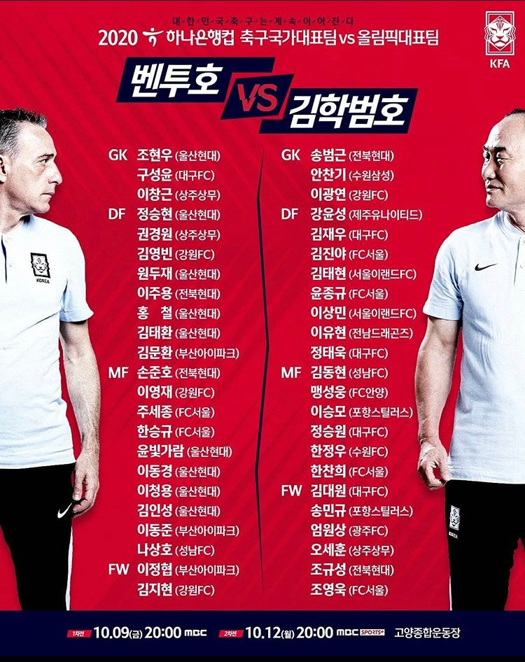 벤투 감독의 A대표팀, 김학범 감독의 올림픽대표팀의 맞대결이 10월 9일, 12일 두 차례 펼쳐진다. 코로나 19의 특수한 상황 탓에 조직력을 다지고, 옥석을 가려내기 위해 K리그 선수들이 대거 소집됐다. A매치가 중단된 상황에서 팬들에게 새로운 활력소가 될 경기에 K리그 스타들이 대거 발탁됐다. 특히 리그 1위를 달리는 울산은 무려 8명의 선수를 A대표팀에 배출하며 강팀임을 증명했다. (홍철의 무릎 부상으로 심상민이 대체 발탁됐다.) 그중에서도 중원에서 알토란 같은 활약을 펼친 원두재는 처음으로 A대표팀에 뽑히며 실력을 인정받았다. 한편 강원 경기에 자주 등장한 벤투 감독은 강원 선수들을 울산 다음으로 많이 택했다. 김영빈, 이영재, 인현식, 김지현 4명이 나란히 국가대표에 발탁됐지만, 상승세의 포항은 아무도 A대표팀에 뽑히지 못했다. 대신 송민규, 이승모가 올림픽 대표팀에만 뽑히며, K리그 돌풍을 이어갈 전망이다. 프로 3년 차 송민규는 올 시즌 '영 플레이어상'의 가장 유력한 후보로, 자신감 있게 올림픽에 가고 싶다는 포부를 밝힌 바 있다. 그의 재기 발랄하고 자신감 넘치는 플레이는 A대표팀도 쉽게 당해내지 못할 전망이다.