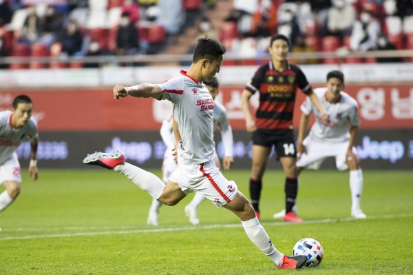 '행복 축구'의 주인공 포항과 상주가 최종전을 치렀고, 3,280명의 관중이 스틸야드를 찾았다. K리그1 마지막 경기를 치르는 상주는 4-1-4-1 포메이션으로 나섰다. 김태완 감독은 "포항전에선 난타전 제대로 하고 싶다. 최상의 멤버를 꾸리겠다"라며 이미 공격 축구를 예고했다. 최전방은 활동량이 뛰어난 박동진이 맡았고, 박용우, 허용준, 김보섭, 송승민이 조력자로 나섰다. 주장 권경원은 유종의 미를 거두기 위해 포백의 지휘를 맡았다. 포항 역시 다득점 1위를 위해 공격적인 선수들을 대거 기용했다. 먼저 고국으로 떠난 팔로세비치의 빈자리를 이승모가 메웠고, 송민규와 심동운이 측면에 선발 투입됐다. 레전드 김광석이 벤치에서 시작하는 대신 권완규와 하창래가 중앙 수비를 맡았다. 득점 2위 일류첸코 역시 최전방에 투입돼 공격의 무게감을 높였다.