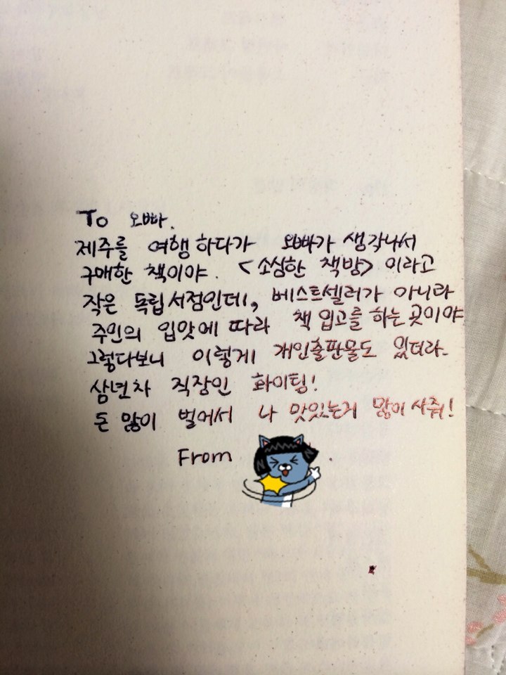 - 이 책을 나에게 선물한 동생도 어느덧 삼년차겠구나. 어디서나 힘내고 당당하게 지내길.