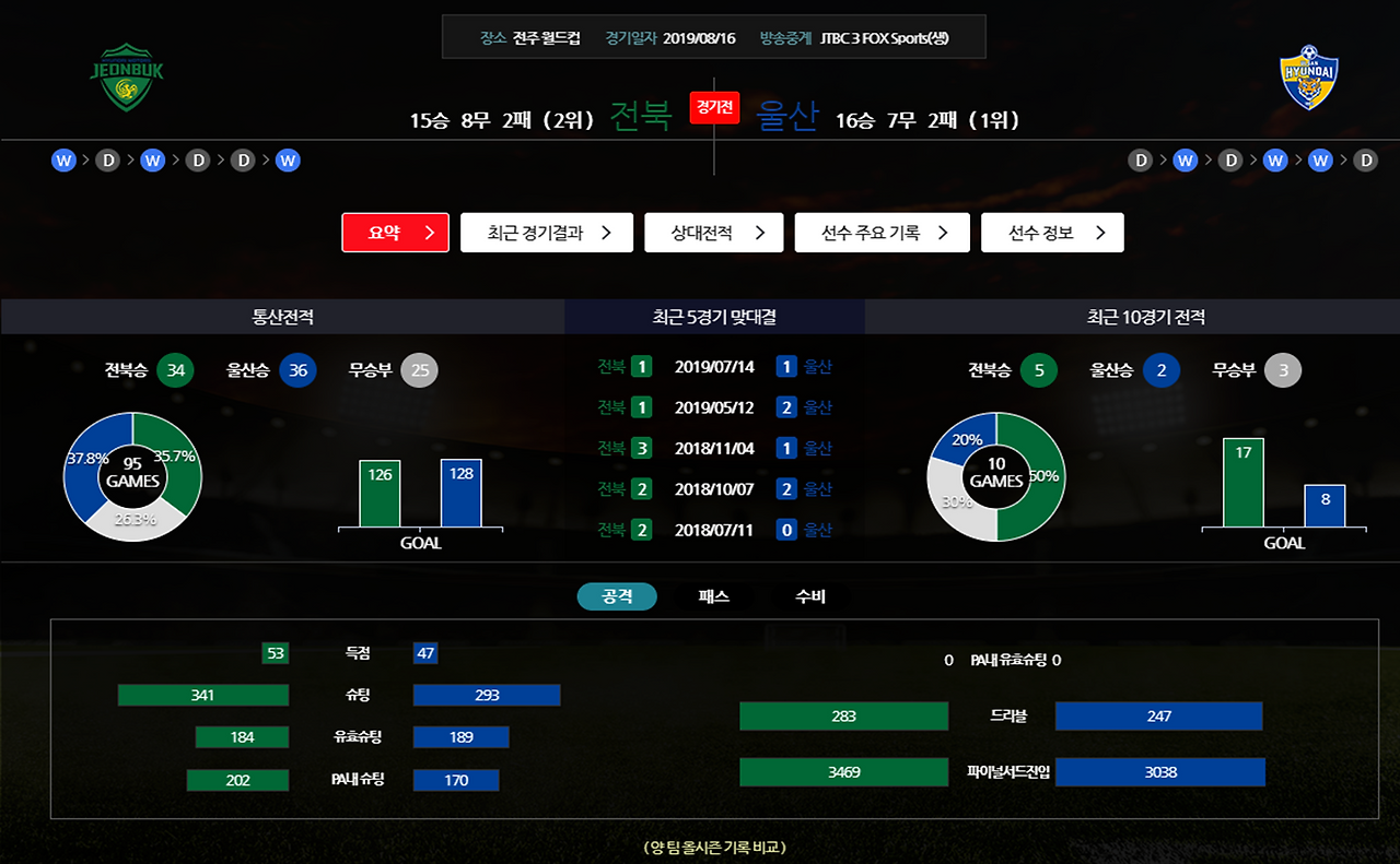 명실상부 우승 후보인 두 팀의 맞대결이다. 이적 시장 막바지까지 김승대, 김승규, 권경원 등 두 팀은 전력 보강에 힘썼다. 승점은 단 1점 차이지만, 공격과 수비의 팀컬러가 확실하다. 전북은 53골로 리그 내 유일한 50골 이상 기록팀으로 김신욱이 떠났지만 문선민(8골), 이동국(6골), 로페즈, 임선영(5골) 등 다양한 공격 루트를 활용하고 있다. 지난 포항전 손준호의 경고 누적 결장에도 한승규가 골을 터뜨리는 등 스쿼드가 두터운 것도 장점이다. 울산 역시 리그 최소 실점(20 실점)으로 짠물 수비를 이어가고 있다. 부상을 당한 불투이스의 빈자리는 강민수가 메우고 있고, 국가대표 김승규가 골문을 지킨다. 한편 제주전 5대0 대승을 이끌고, 2라운드 연속 리그 MVP에 오른 김보경의 발끝도 매섭다. 주니오와 함께 나란히 10골로 리그 득점 2위를 달리고 있는 김보경의 노련한 경기 운영이 발 빠른 윙어들의 폭발력도 극대화할 전망이다.