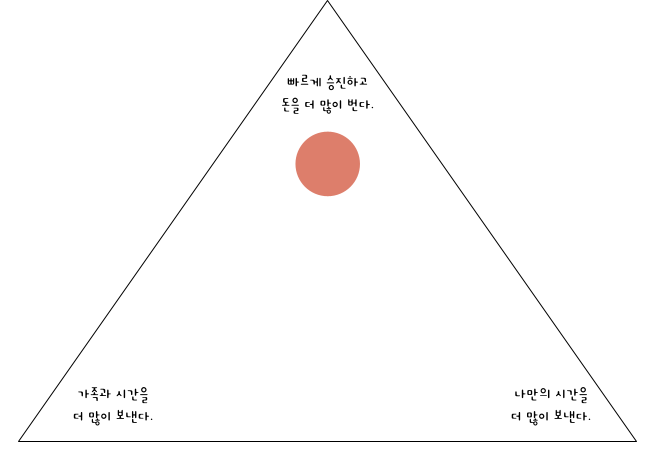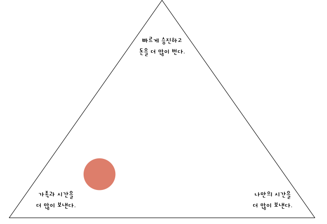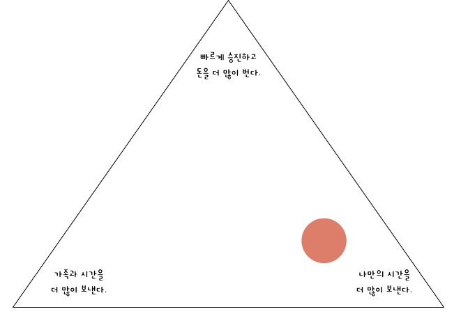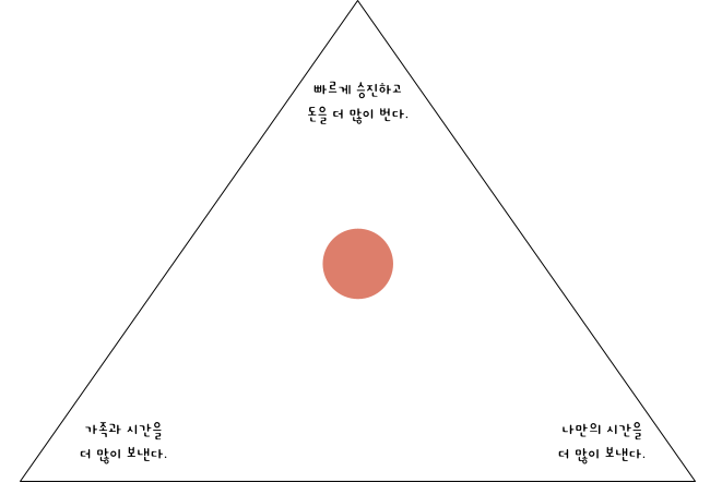 가운데 점을 돈과 커리어 쪽으로, 상단 방향로 움직이면 가족과 나와는 무게중심이 점점 멀어지게 된다.