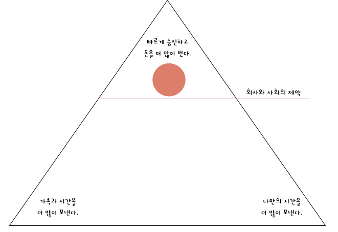 한국의 워라밸 딜레마 삼각형은 다음과 같다. 52시간 근로제 등 사회적 합의를 하여 단일한 규칙을 만든다. 그래서 빨간 점은 일정 범위 이상 일에서 벗어날 수 없다. 근무 시간도 정해져 있고 야근도 개인의 선택이라기보다는 팀장의 선택에 가깝다.