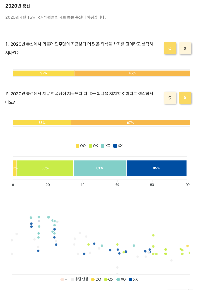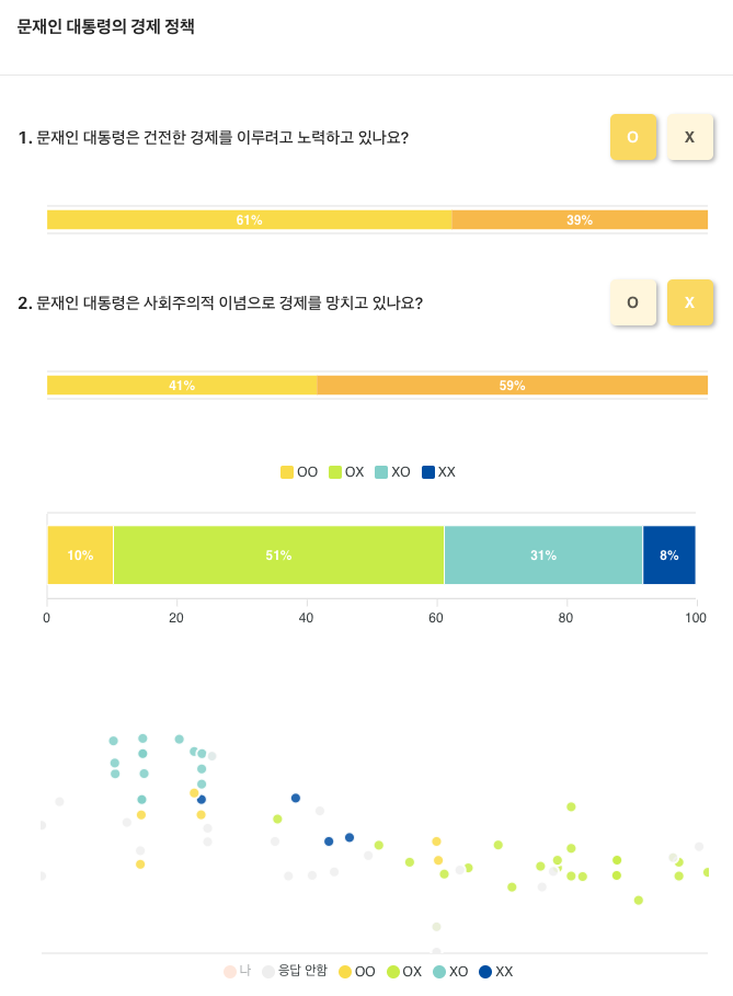 문재인 대통령의 경제 정책에 대해서는 노력에 대해서는 극 보수층을 제외하고는 인정하는 분위기인 것 같습니다. 사회주의적인 이념이라고 생각하는 분도 있었습니다 (XO, OO). 대부분 미래 통합당과 입장을 같이 하시는 분들이었지만 중도 보수 쪽에서는 공감을 못 얻은 것 같습니다.