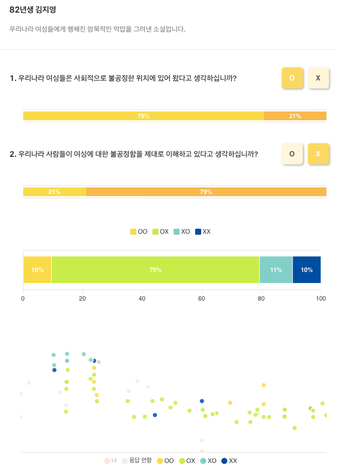 82년생 김지영으로 대표되는 여성 차별 문제에 대해서도 물어보았습니다. 진보 보수를 막론하고 여성들이 불공정한 위치에 있었다고 인정하는 것 같습니다 (OO, OX). 그런데 미래 통합당 지지자들은 그렇게 생각하지 않았습니다. 다행인 것은 여성에 대한 불공정에 대한 공감이 생각보다 널리 퍼져 있다는 것입니다. 다만 목소리 큰 소수가 여성 혐오의 이야기를 하고 있는 것 같습니다.