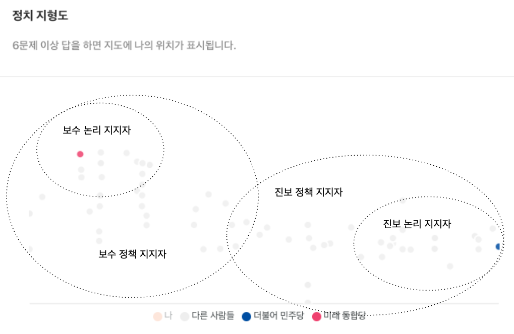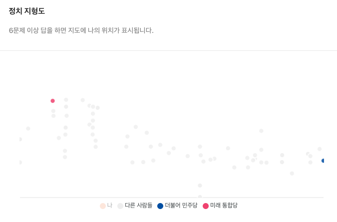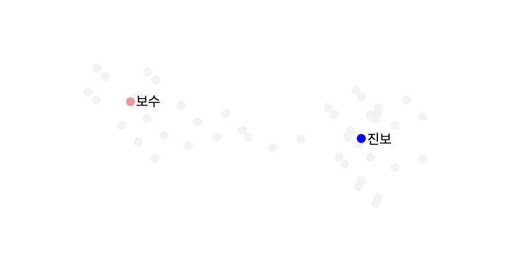 그런데 oxopolitics 데이터가 그린 실제 지형도는 꽤 달랐습니다. (모든 스크린샷에 "나"는 제외하였습니다.)
