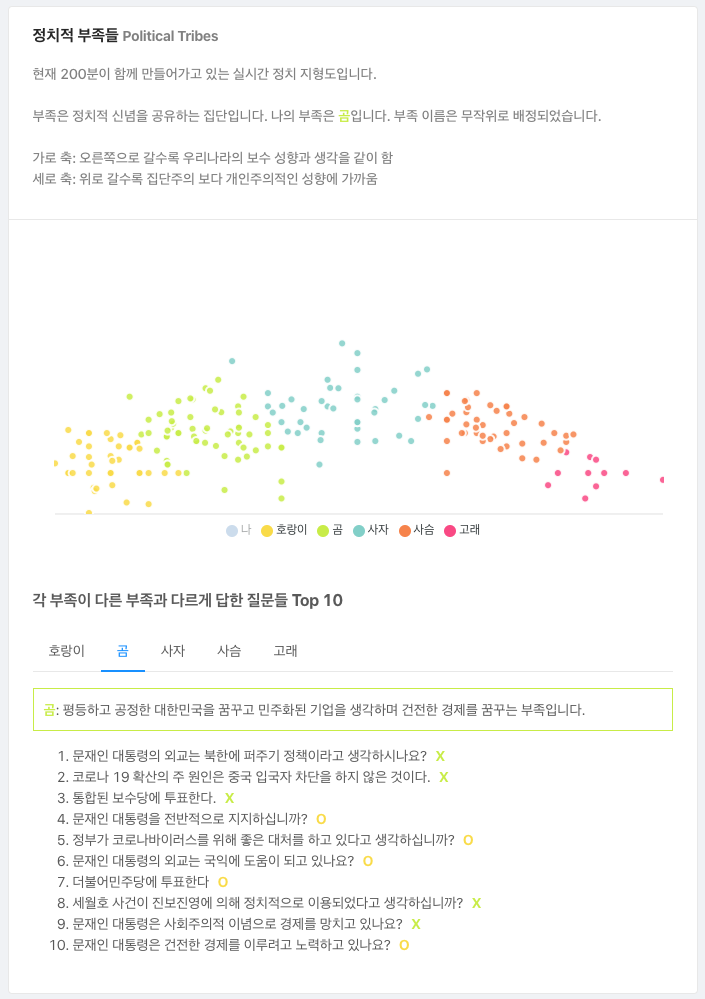 그래서 oxopolitics 세 번째 버전에서는 "정치적 부족 (political tribes)"의 개념을 가장 중심에 두었습니다. 내가 무슨 생각을 하는 사람인지를 먼저 생각하는 것입니다. 물론 단순히 좌-우 5개의 부족으로 나누다 보니 대변되지 않는 목소리가 많습니다. 특히 규제 개혁을 요구하는 스타트업계를 한 부족으로 묶는 것은 아직 어려운 상태입니다. 세분화된 부족은 향후 버전에서 담을 예정입니다.