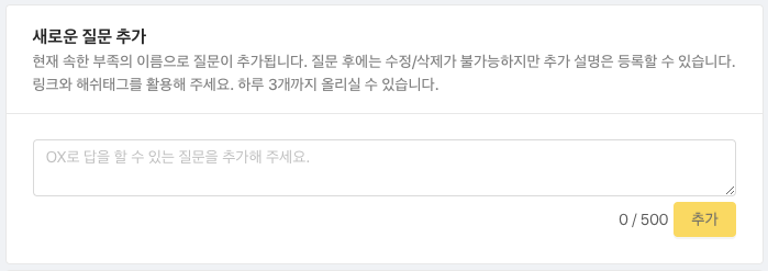 누구나 질문을 추가할 수 있게 해서 의제 설정 기능을 추가했습니다. 질문은 현재 내 부족의 이름으로 올라가며, 질문 추가 후에는 삭제나 수정은 관리자가 아니면 어렵지만 추가 설명을 5회까지 등록할 수 있습니다.