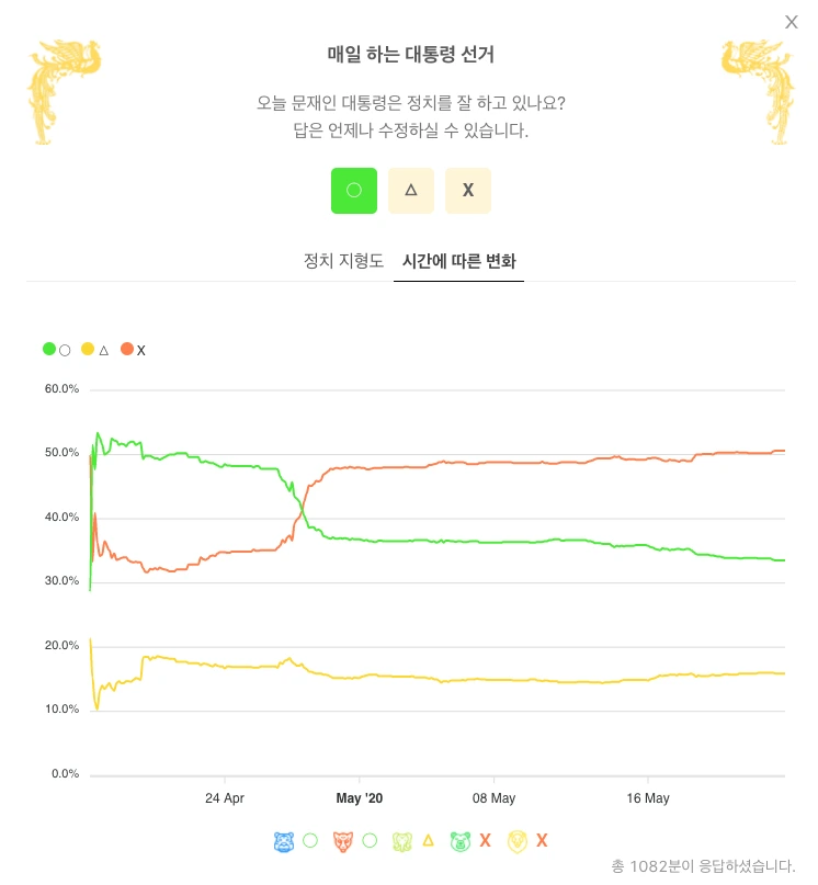 여러 주제와 사람들의 발언, 언론의 기사, 대통령의 정치, 정당의 활동 등에 OX버튼과 Like버튼으로 의사 표현을 할 수 있다. 이러한 간단한 투표가 모여 다양한 차트가 만들어져서 각 사안별, 정당별, 정치인 별 데이터가 쌓여가고 함께 볼 수 있게 된다.