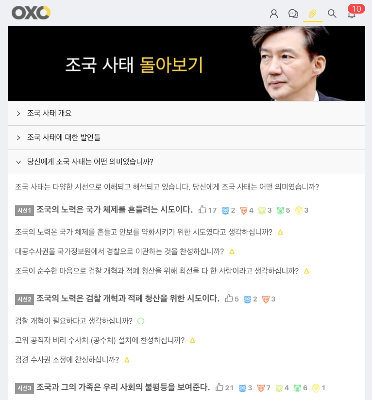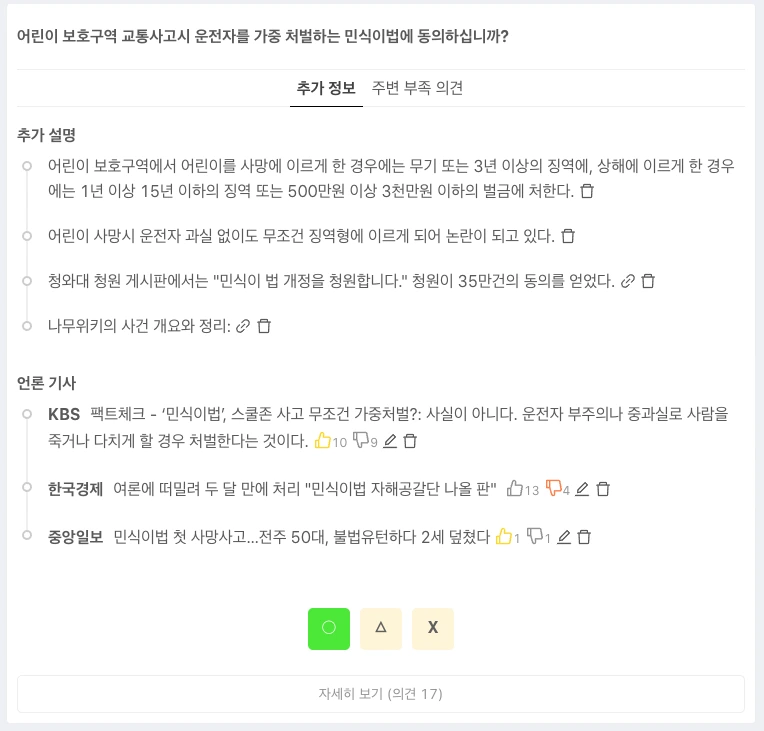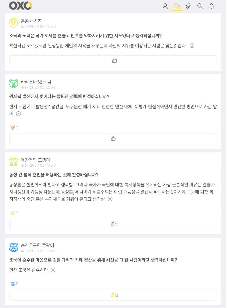 이러한 목소리를 모으기 위해서 오랜 시간 고민한 기능들 중 첫 번째는 OX응답이다. 가장 쉽게 나의 의사를 표현할 수 있는 것은 공감과 무관심을 표현할 수 있는 Like 버튼이고, 그다음으로 간단히 의사를 표현할 수 있는 것은 찬성과 반대를 표현할 수 있는 OX이다. 그래서 이 데이터 플랫폼을 OXOpolitics라고 이름 지었다.