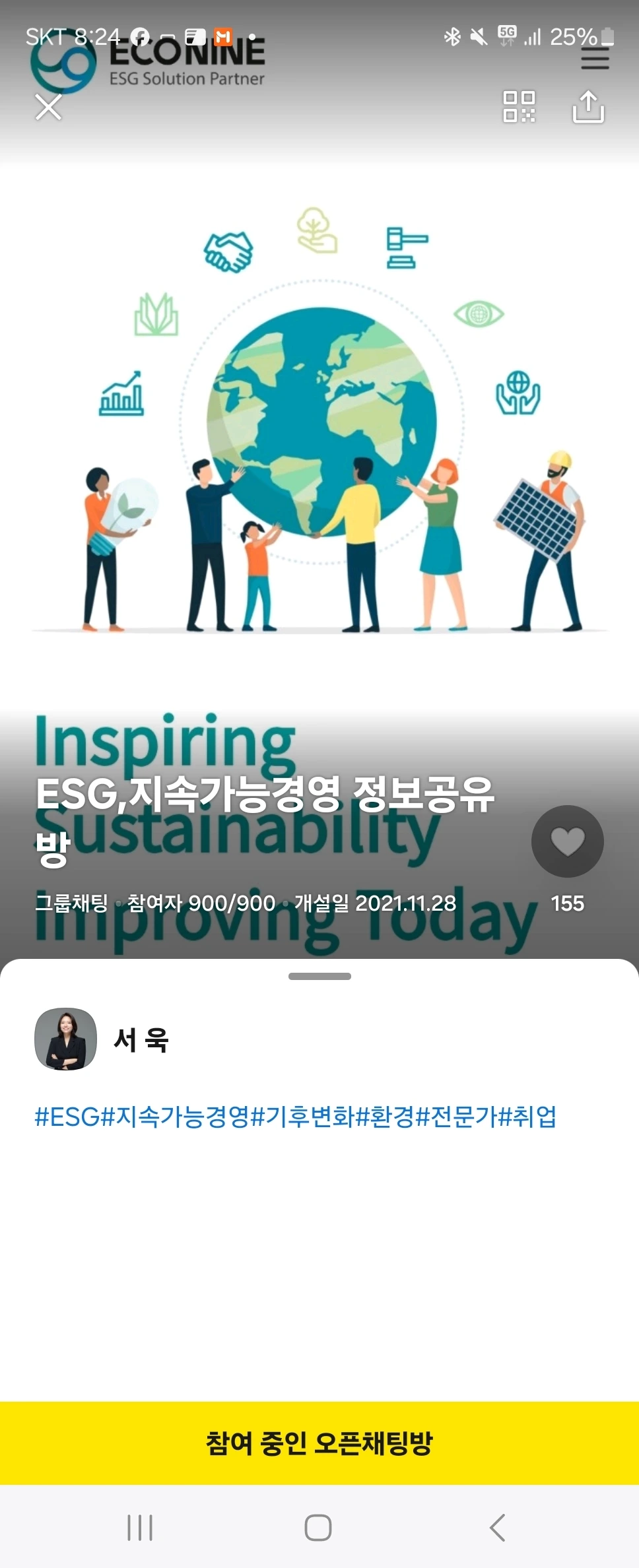 2021년에 개설했던 오픈채팅방에 어느덧 900명이 모이셨어요. 가용할 수 있는 최대 인원이 900명인지 모른 채 몇 주가 지났네요. 1500명으로 넓혀 두었습니다. 홍보성이나 투기성 메시지를 투척하시는 분들이 정말 가끔 있었지만, ESG생태계에서 이뤄지는 채용, 교육, 설문, 문의 등이 자유롭게 오가고 있습니다. 처음엔 의미 있는 기사 공유해 봐야지 시작한 작은 걸음인데 말이에요. 방 입구 사진도 에코나인 초기 홈페이지 메인 화면이네요. 저도 에코나인도 에코니언들에게도 많은 일들이 있었고, ESG생태계 안에서도 다양한 시도와 성장과 부침이 있었을 거예요.