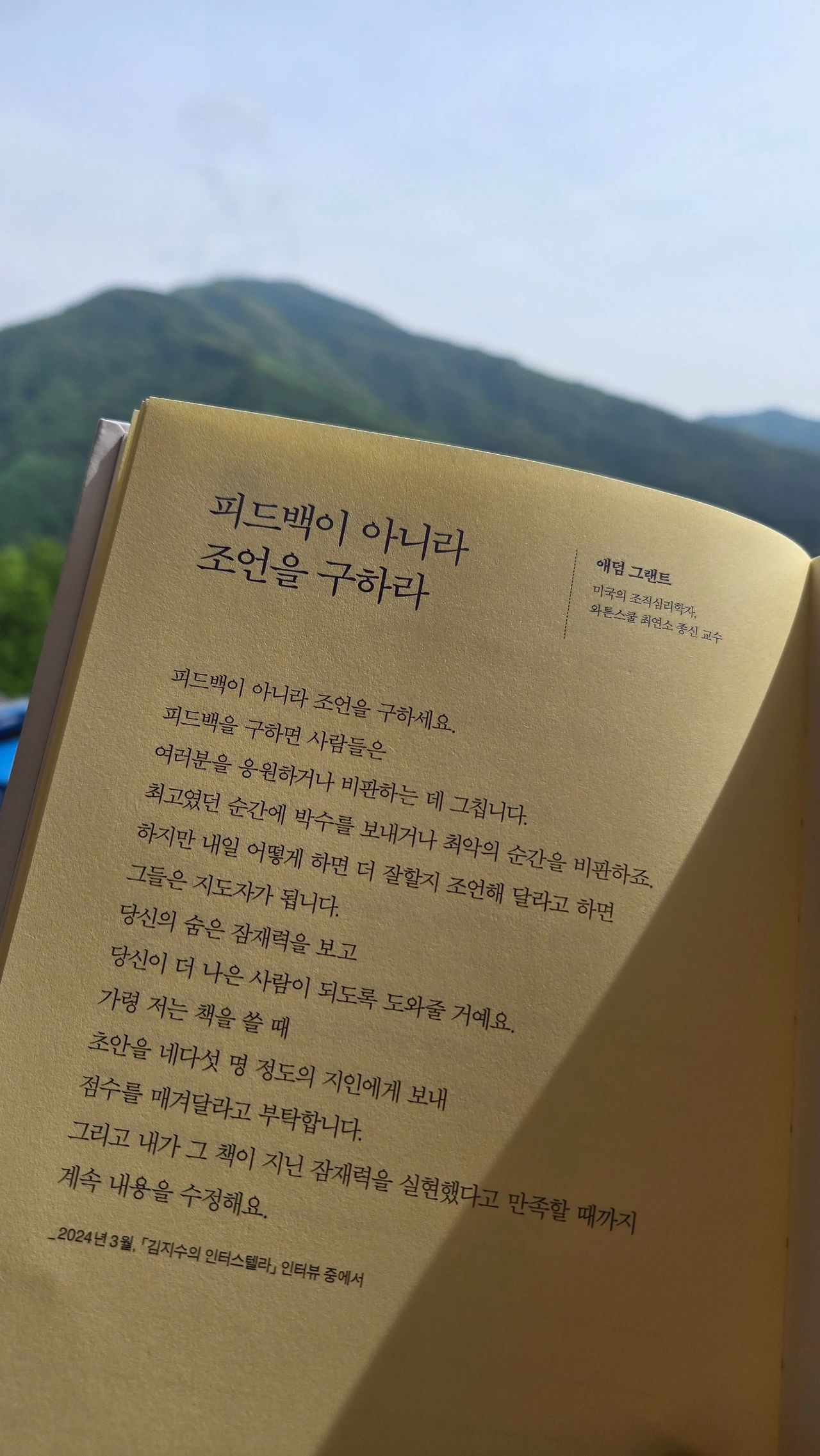조언을 부담스러워하는 때에 되려 조언을 구하는 사람이 있다면 상대가 나를 진심으로 인정한다고 믿으며 기꺼이 도움이 되려고 노력할 것 같아요.