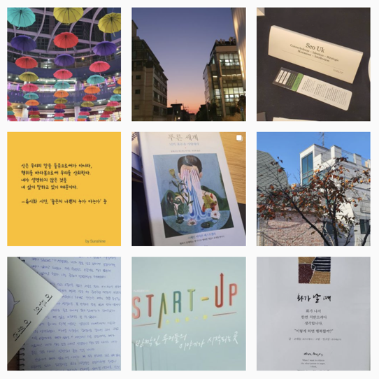 1년 전에 인스타그램을 시작했다. 목표는 글쓰기 모임 활성화. 인스타그램과 글쓰기 활성과가 얼마나 관련이 있는지는 명확하지 않다. 대신 인스타그램에 주로 무엇을 올리게 되는지 정리가 되기 시작했다. 글쓰기 모임의 분위기를 알 수 있는 사진과 몇 개의 공지를 빼면 마음이 동할 때마다 Feed를 올렸기 때문이다.