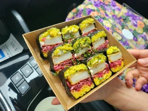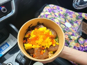 하필 그 날은 휴무였다. 여행 첫 날부터 계획이 어그러지는 기분이었다. 그 짧은 순간 우리의 7년 전 신혼여행지였던 캐나다가 떠올랐다. 오로라를 보고 싶어 밴쿠버에서 비행기를 타고 옐로나이프까지 넘어갔지만 딱 일주일 차로 폭설이 내리며 오로라를 보는 장소가 폐쇄가 되었고, 록키 쪽의 서퍼마운틴이라는 높은 산자락에 1인당 10만원이 넘는 케이블카를 올라탔지만 그 또한 폭설로 인해 아래 경치를 내려다 볼 수도 없었다. 하지만 우리의 장점은 그럼에도 숨은 그림찾기 보다 재미를 더 잘 찾는 편이었다. 사실 이 부분에서는 아내의 긍정에너지에 감사할 따름이다. 역시나 아내는 이 상황 속에서도 한 블럭 앞 쪽에 있는 수상한 가게를 눈여겨 보고 있었다. 관광객들로 보이는 사람들이 어느 조그마한 가게를 끊임없이 들어간다는 것이다. 마침 갈 곳도 잃은 우리는 휴무로 문을 닫은 원래의 가게 앞에 차를 주차하고, 사람들이 끊임없이 들어가는 장소로 들어가 보았다. 가게 안은 좁은 입구에 비해 꽤 넓었다. 문을 열자마자 우편에는 카운터가 있었고, 앞서 들어갔던 사람들이 대기하며 서있었고, 안 쪽에는 테이블과 함께 사람들이 식사를 하고 있었다. 메뉴를 보니 새우를 기반으로 한 김밥, 덮밥 등이 있었는데 이름이 범상치가 않았다. #딱새우김밥 #새우간장컵밥 #딱새우꼬막무침