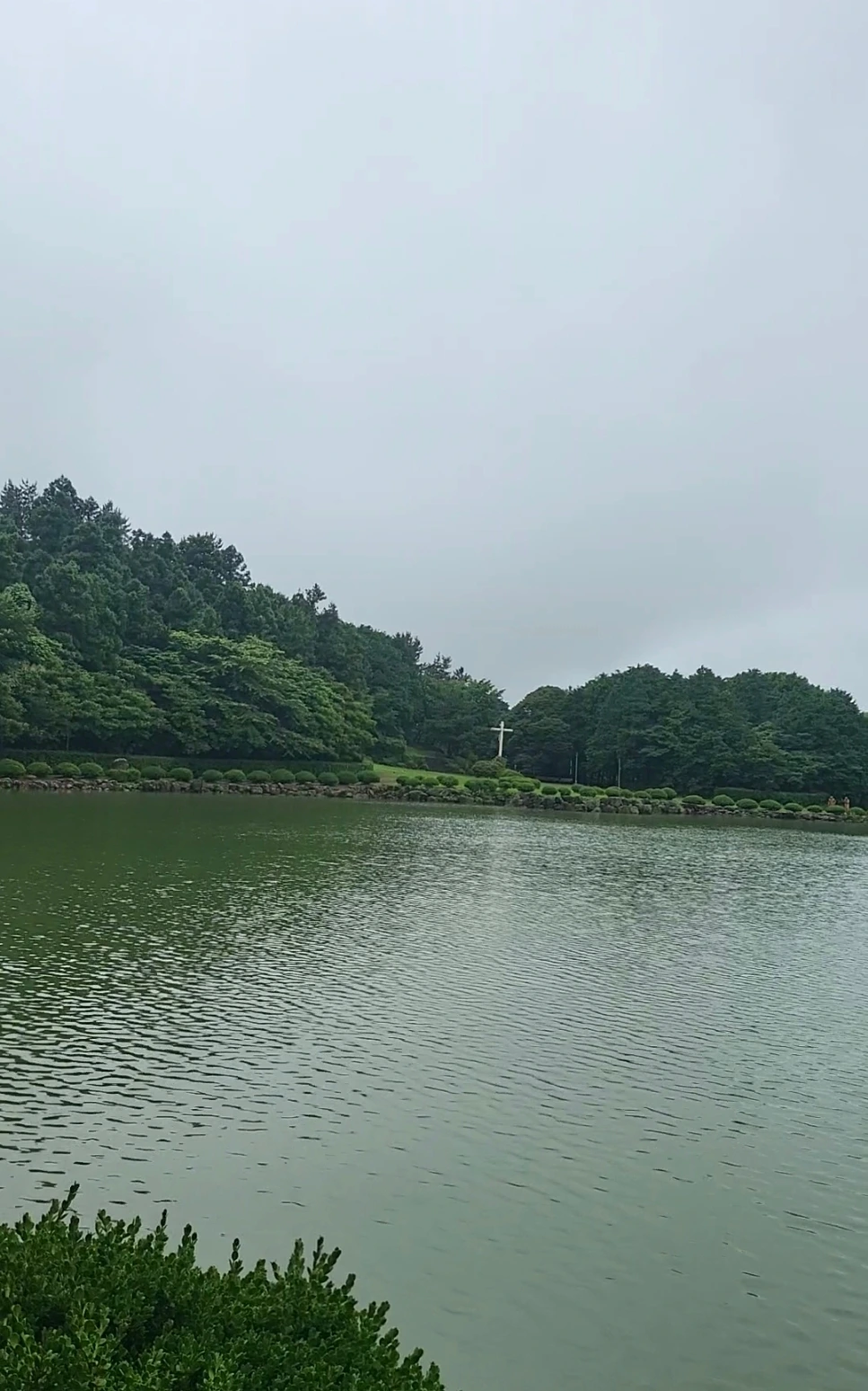 야외 동굴 예배당을 지나 조금 걷다보니 십자가가 보였다. 삼뫼소에 다왔다는 표식이기도 하다. 십자가에 다가서니 아래에는 사도신경이 새겨져 있었다. 그리고 그 뒤편으로 커다란 호수가 보였다. 삼뫼소였다.