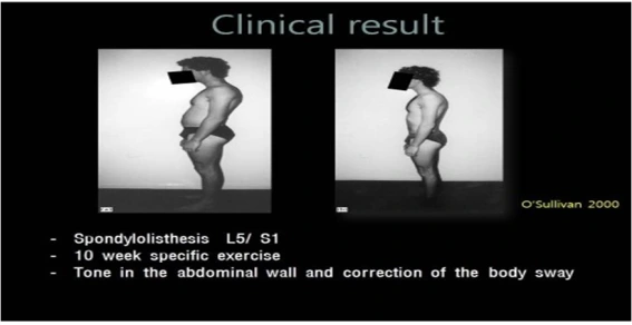 요추 5번과 천골 1번사이의 ‘척추분리증(spondylolisthesis)을 보이는 환자에게 10주간 코어운동을 실시한 결과 정상적인 척추 굴곡을 회복할 수 있게 되었다.