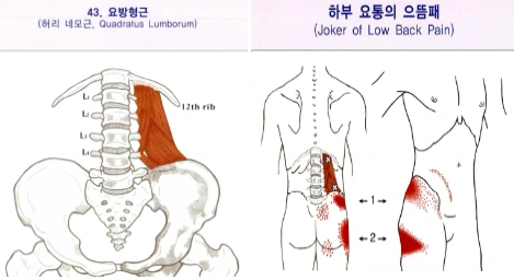 요방형근은 허리가 아플 때 가장 먼저 체크라는 곳이다. ‘요통의 대명사’, ‘하부 요통의 으뜸 패’라는 명칭이 따라다닌다. 심하면 혼자서 똑바로 서 있기가 힘들 정도이며, 한쪽 골반이 올라가기도 한다. 요방형근만 잘 풀어 준다면 허리에서 느껴지는 통증을 해소할 수 있게 된다.