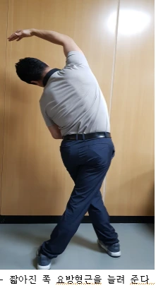 만약에 옆으로 구부리기에 제한이 있는 경우(손가락이 더 안 내려오는 곳)는 반대쪽의 근육(요방형근)이 짧아져(굳어져) 있는 경우라 할 수 있다. 요방형근은 양쪽, 몸 뒤에 신장(콩팥)과 가까운 곳에 있어서 요방형근의 굳음 증은 방광을 압력하여, 아침에 소변이 가득 찬 채로 잠자리에서 일어날 경우에 허리 통증을 유발하게 된다.