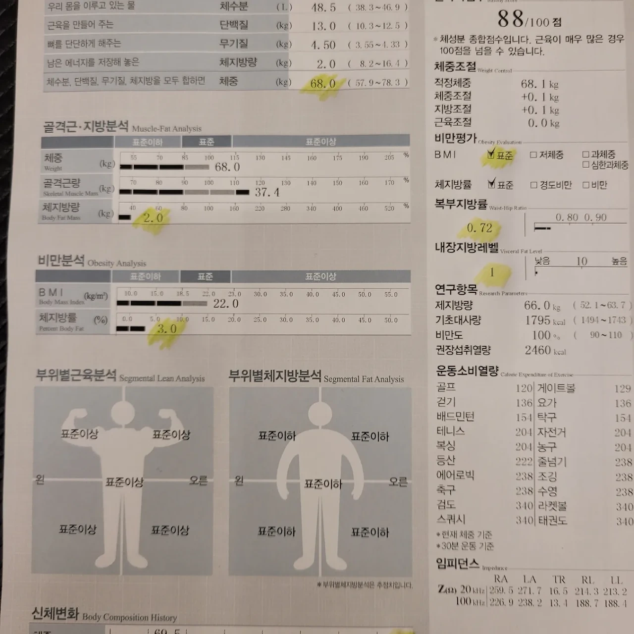 근육량도 0.6킬로 떨어진 것 외에는 크게 달라지지 않았다. 기초대사량도 마찬가지다.