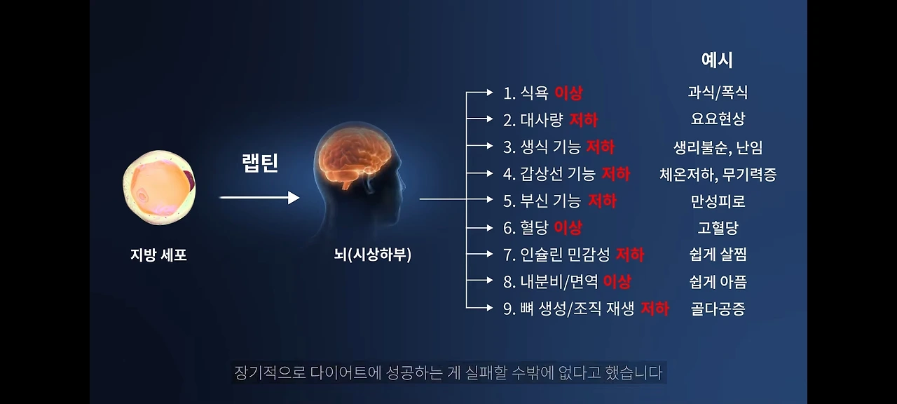 그런데 단기간 체중을 감량하는 데 급급한 경우, 랩틴이라는 호르몬을 들여다보지 못했기에 렙틴의 분비 기능이 탄력적이지 못하게 된다. 그래서 예전처럼 식사량과 운동량을 유지하지 못하게 되면 뇌는 식욕을 높이고, 기초대사량을 떨어뜨려 체중을 늘리려는 작업에 들어가게 된다. 가령 하루 칼로리량을 1,700칼로리를 먹으면서 체중을 유지했으면 평생 그렇게 먹어야 원래 체중을 고수할 수 있게 된다. 여기서 2,500칼로리로 늘리면 대번에 체중은 늘어나고 만다는 것이다. 이러한 현상은 렙틴의 기능이 똑똑하지 못하다는 증거이다.