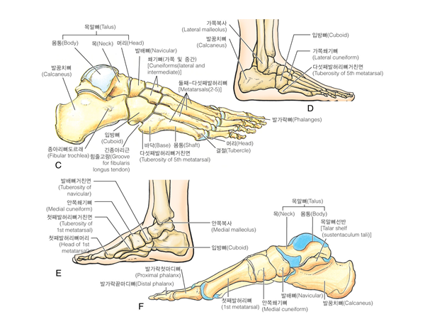 전신의 뼈가 206개다. 그 중 발에는 26개 양쪽 52개의 뼈가 있다. 약 26%의 뼈가 발에 포진해 있다. 좀 더 발의 구성을 알아보자. 근육은 19개, 인대는 107개, 관절은 30개.