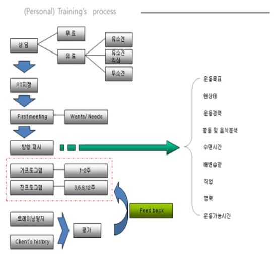 회원과의 상담을 통해 얻은 정보들을 수렴하여 회원의 욕구를 충족시킬 수 있도록 운동 플랜을 작성해야 하고 그 작성된 플랜으로 그날의 운동 프로그램을 계획하고 수업이 끝나면 특이 사항 들을 일지를 통해 적고 다음 수업 시 피드백을 할 수 있도록 체계적이진 않더라도 대략의 트레이닝 과정들을 기록해 둔다.