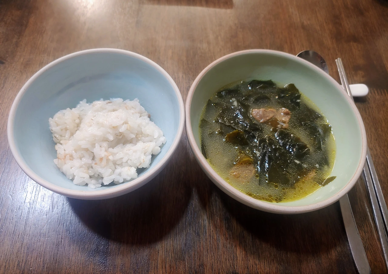 생일 아침, 남편은 내게 앉아있으라 한다. 다행스럽게 전기밥솥 밥은 할 줄 알아서 밥은 아주 잘 되었다. 밥과 하얀 국그릇에 국을 한 대접 떠온 것을 보니 일단 비주얼부터 음... 먹고 싶은 생각이 들지 않았다. 국에 간장을 얼마나 넣었는지 간장에 물을 풀어놓고, 미역을 불려놓은 것 같았다. 그래도 나를 위해 생전 처음 미역국을 끓인 성의가 있으니 먹어봐야 한다.