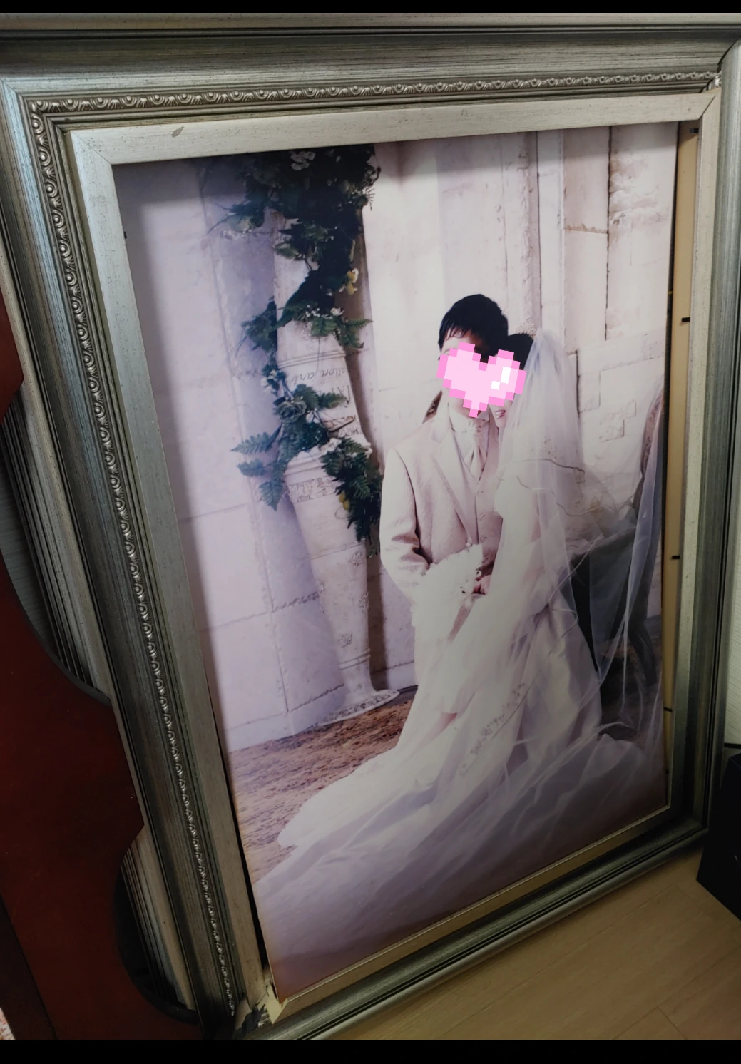 물티슈 한통을 다 써가며 닦았으니 당분간 다시 있던 자리에 두기로 했다. 커다랗고 부담스러운 결혼액자 옆에... 그런데 이번에는 대형 액자의 모서리가 툭 부서졌다. 고민스럽다. 그냥 액자를 치울라니 마음이 불편해지고, 부서진 액자를 두자니 보기에 눈과 생활이 불편하다. 아 이 애물단지....